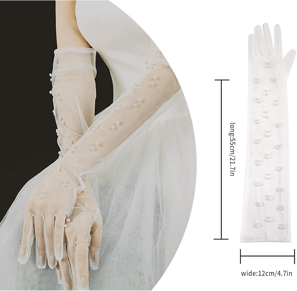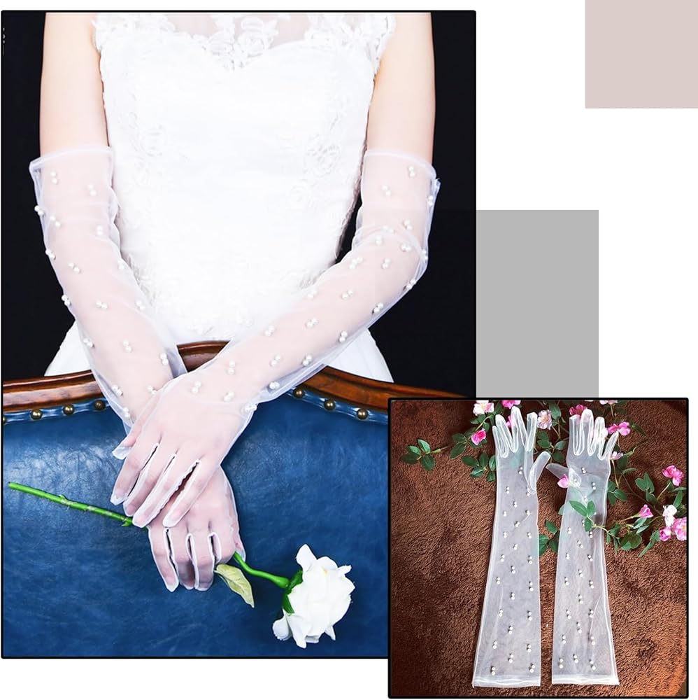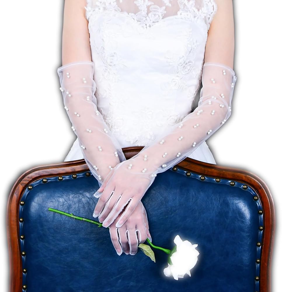 قفازات بيضاء رسمية للنساء، قفازات زفاف للعروس، قفازات بيضاء، لؤلؤية، قفازات الزفاف، قفازات شفافة، قفازات لؤلؤ الزفاف النسائية من التول، قفازات شبكية بيضاء لحفلات مكياج الزفاف والولائم