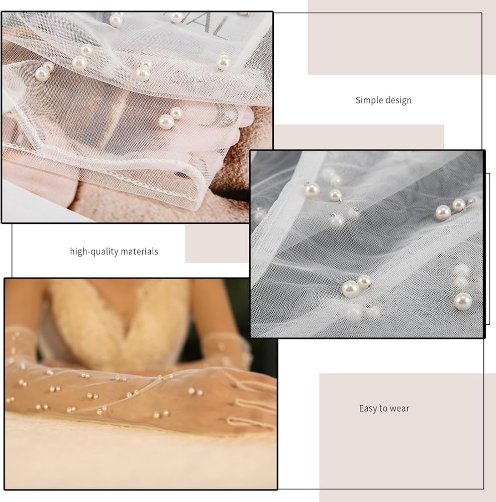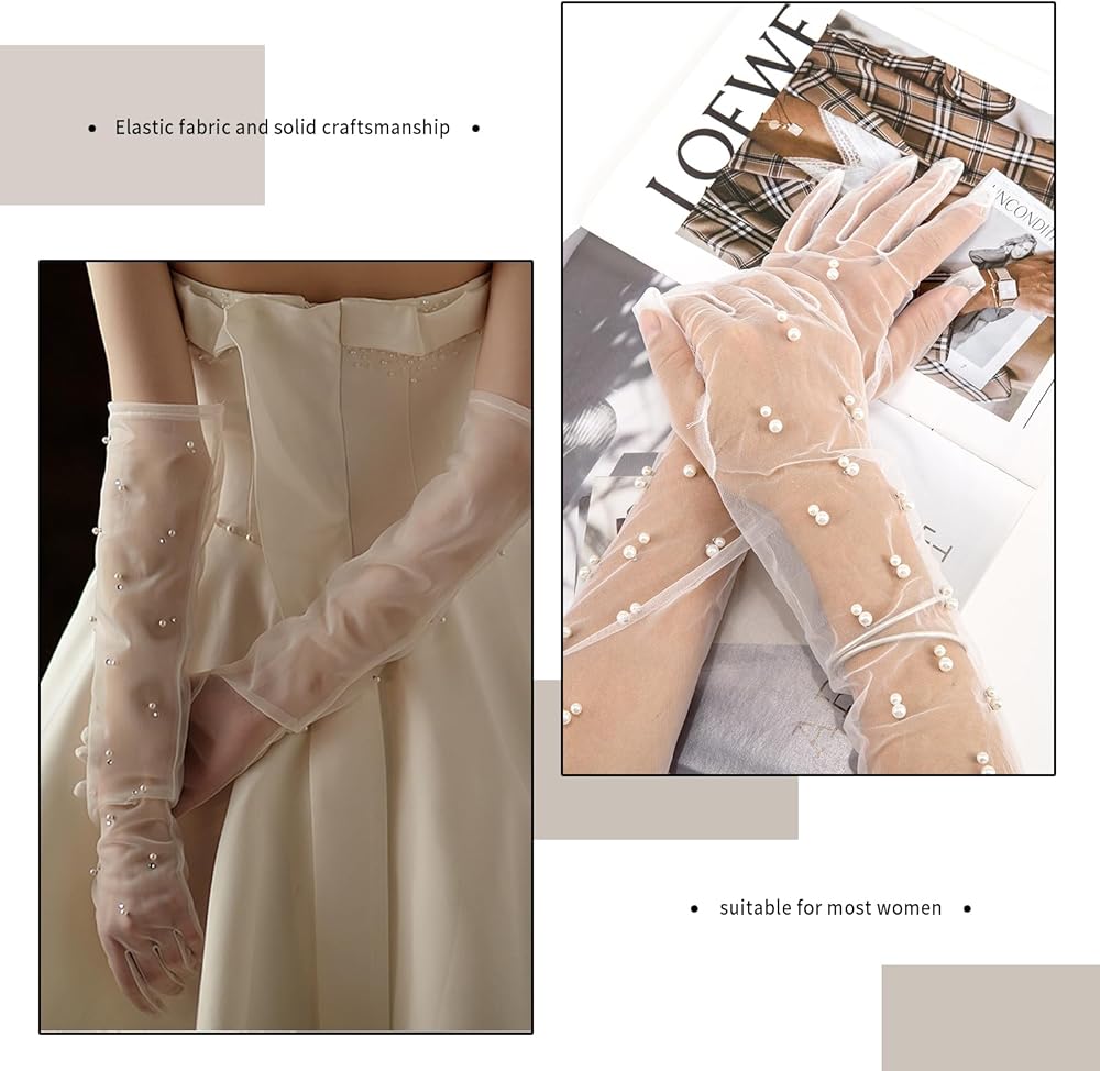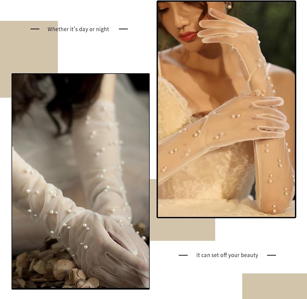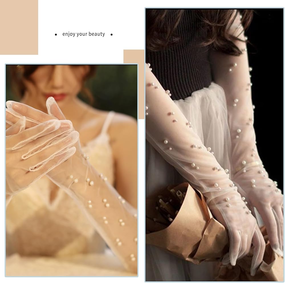 قفازات بيضاء رسمية للنساء، قفازات زفاف للعروس، قفازات بيضاء، لؤلؤية، قفازات الزفاف، قفازات شفافة، قفازات لؤلؤ الزفاف النسائية من التول، قفازات شبكية بيضاء لحفلات مكياج الزفاف والولائم