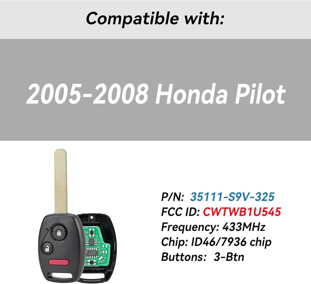 • بالنسبة لمفتاح Honda Pilot البعيد المتوافق مع معرف لجنة الاتصالات الفيدرالية: CWTWB1U545، للحصول على القائمة الكاملة الكاملة، يرجى التحقق من وصف المنتج الخاص بنا. يتم اختبار كل مفتاح بديل عن بعد مسبقًا لضمان الجودة. يتوافق استبدال المفتاح عن بعد هذا مع 2005 2006 2007 2008 Honda Pilot Key Fob.