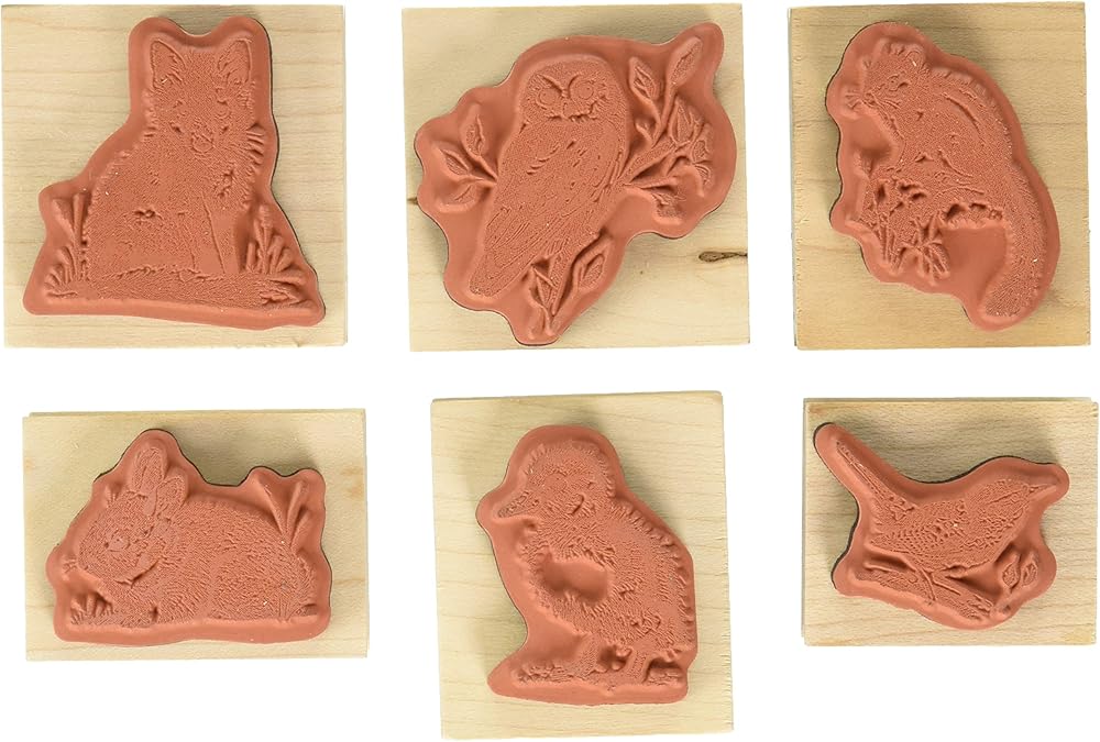 Woodland animals stamp set includes (6) reusable stamps mounted on wooden blocks.
