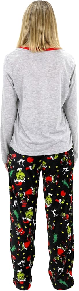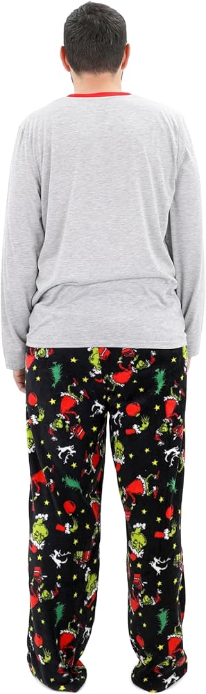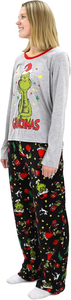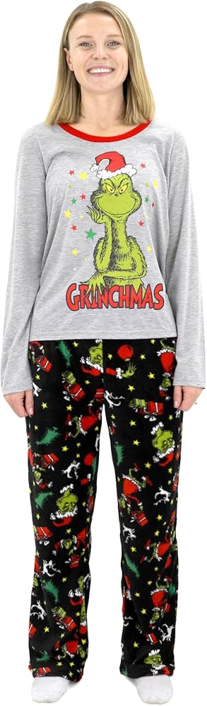 Festive Design: Adult and kids' sets feature a long sleeve top with the Grinch's face and 'Grinchmas' text, paired with plush pants in an all-over Grinch print