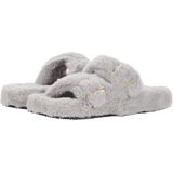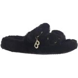 *Fluffy faux fur 2-banded upper with buckle details and rhinestone "B" logo charm *Open toe *Slip-on style *Lightly cushioned footbed *Man-made outsole *Spot clean only *Only one "B" logo charm included per pair *Available in whole sizes only, half sizes please order the next size up
