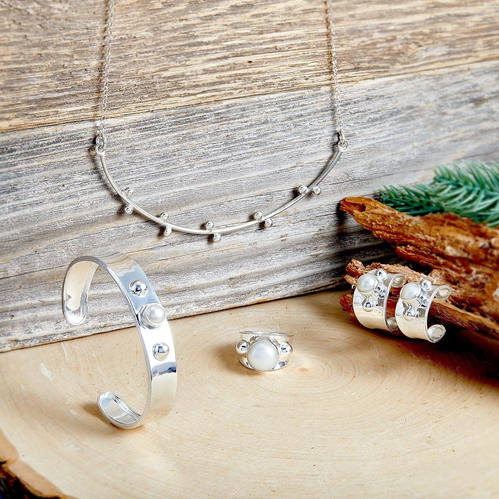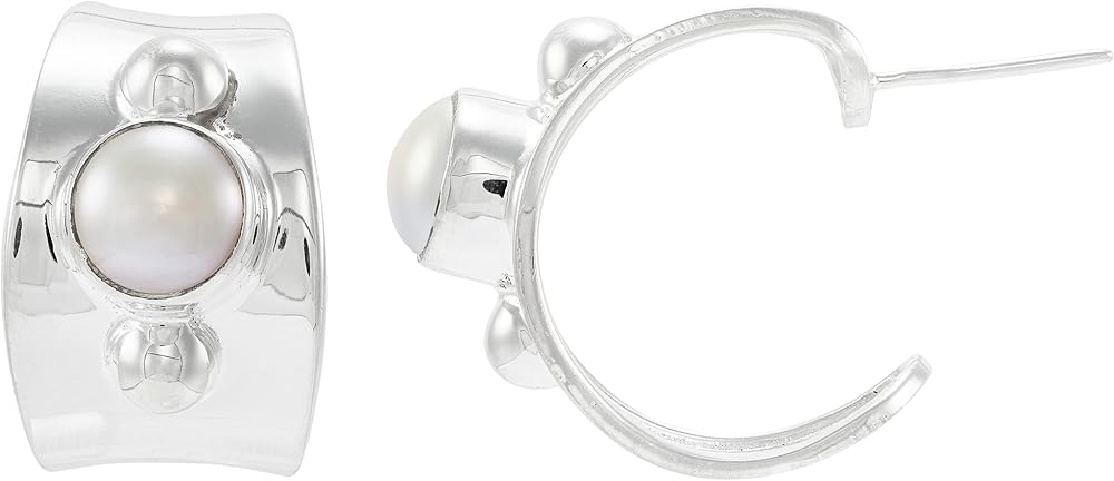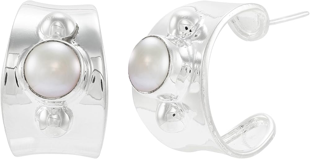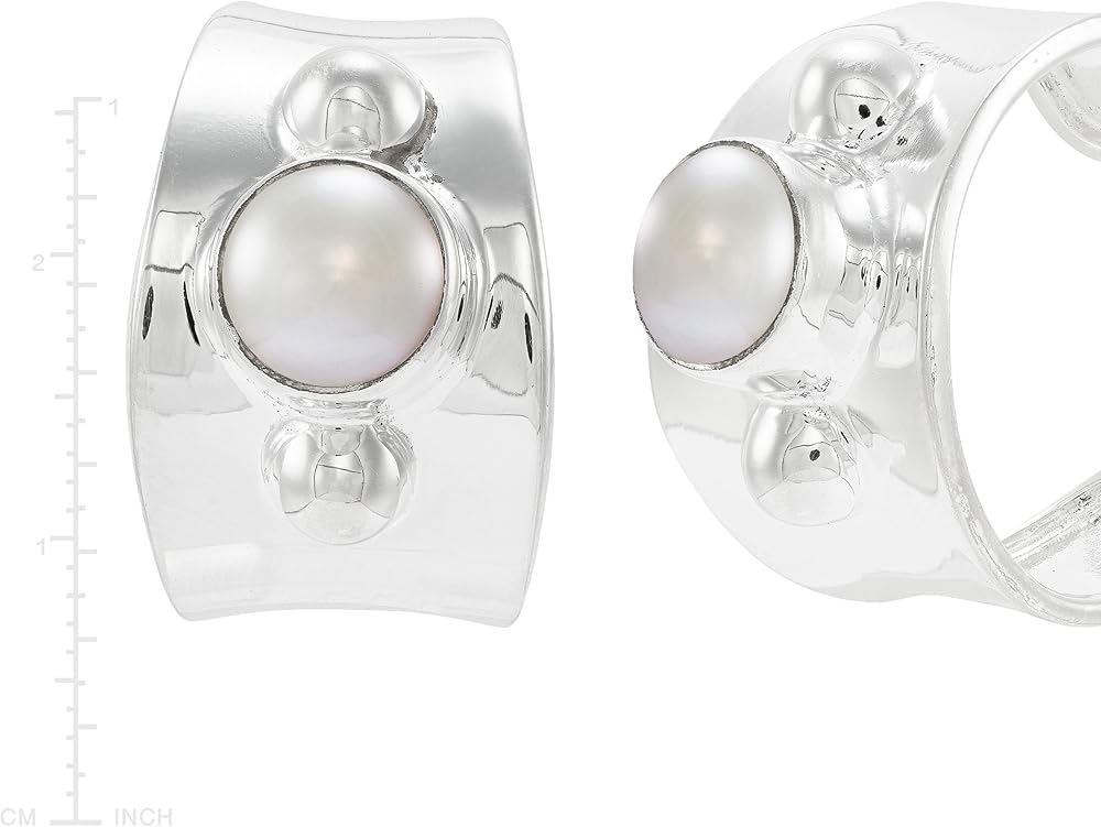 تعرف على أجمل زوج في مجموعتك. تتميز هذه الأطواق بإطارات واسعة تلتف بشكل وثيق حول فصك. تم تشطيبها باللون الفضي اللامع مع لآلئ المياه العذبة مقاس 8 مم في المنتصف. تصمم الحرفي مونيكا زامورا هذا النمط في المكسيك. تأتي القطع مع طوابع من الفضة الإسترلينية ".925" كرموز لجودة المنتج المضمونة.