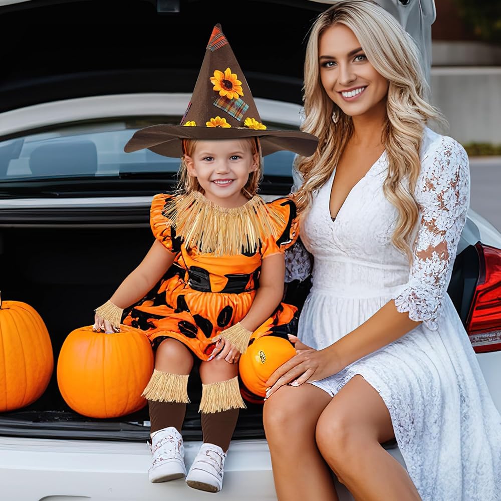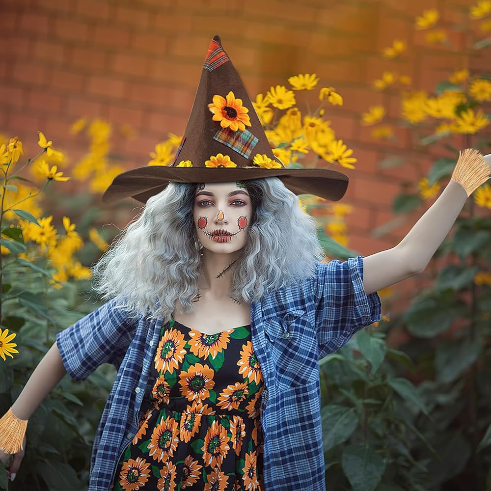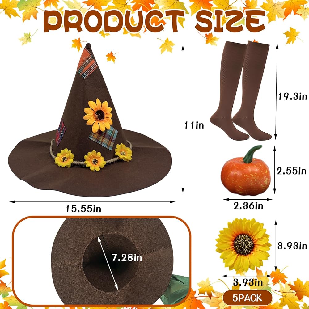 Halloween Scarecrow Costume Set: Set includes 1 Halloween hat with flower patch pumpkin design, 1 straw necklace, 1 pair of straw wristbands, 1 pair of straw ankle straps, 1 pair of socks, 5 fake sunflowers and 1 double-sided tape for your DIY Halloween costume