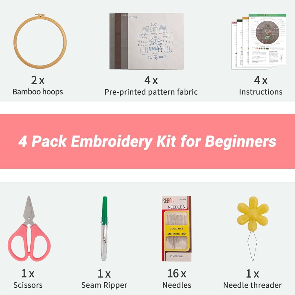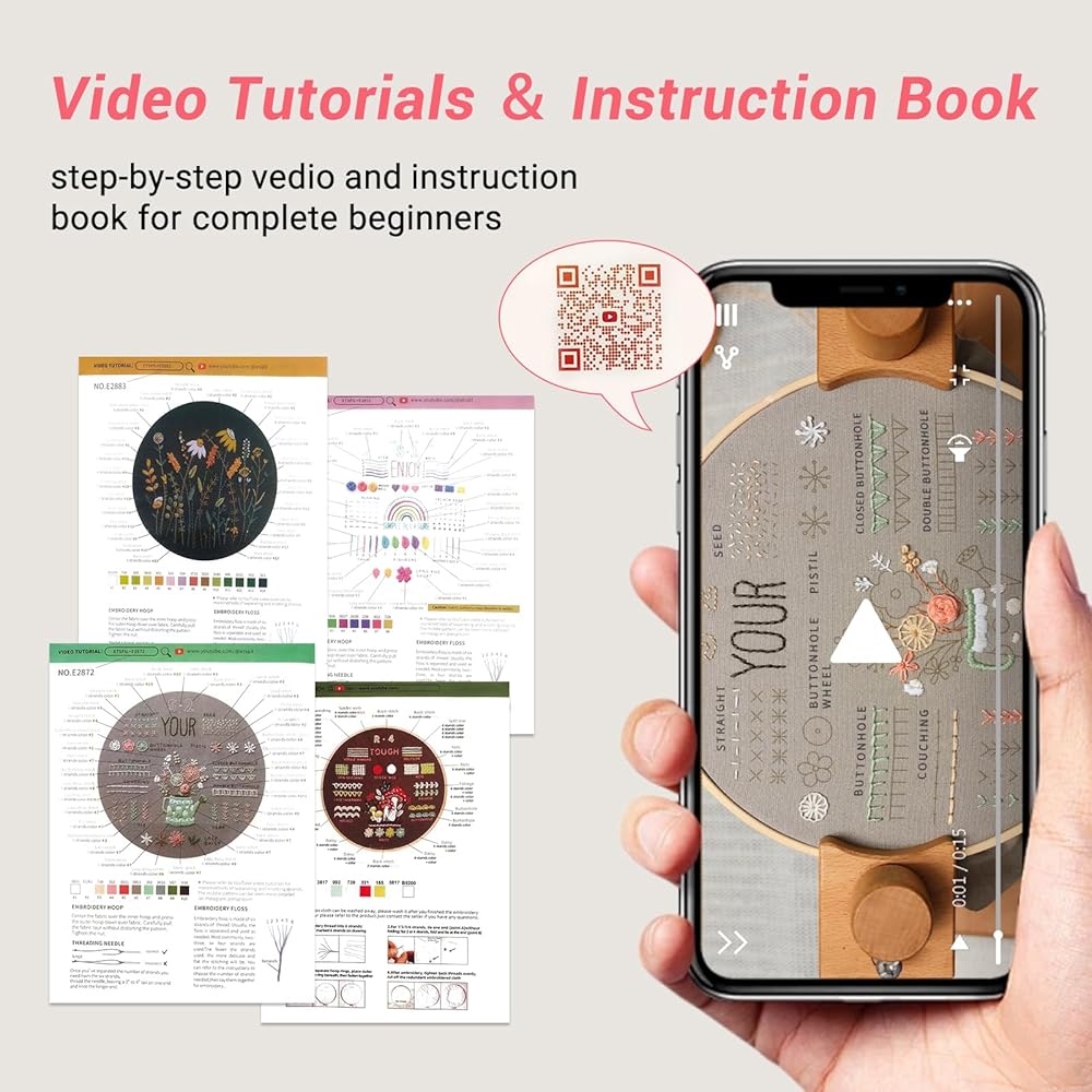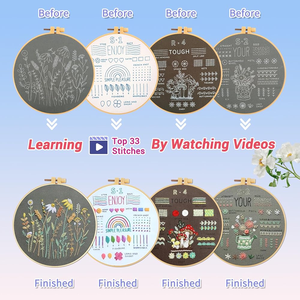 طقم تطريز artgeeker ذو 4 مراحل للمبتدئين والكبار يتقنون 33+ غرزًا مع دروس فيديو شاملة 4 مجموعات من أنماط الأزهار بما في ذلك أطواق وخيوط التطريز المختومة