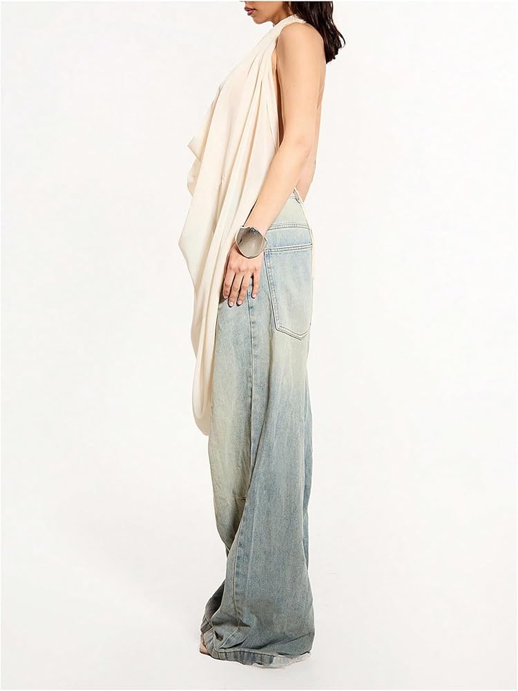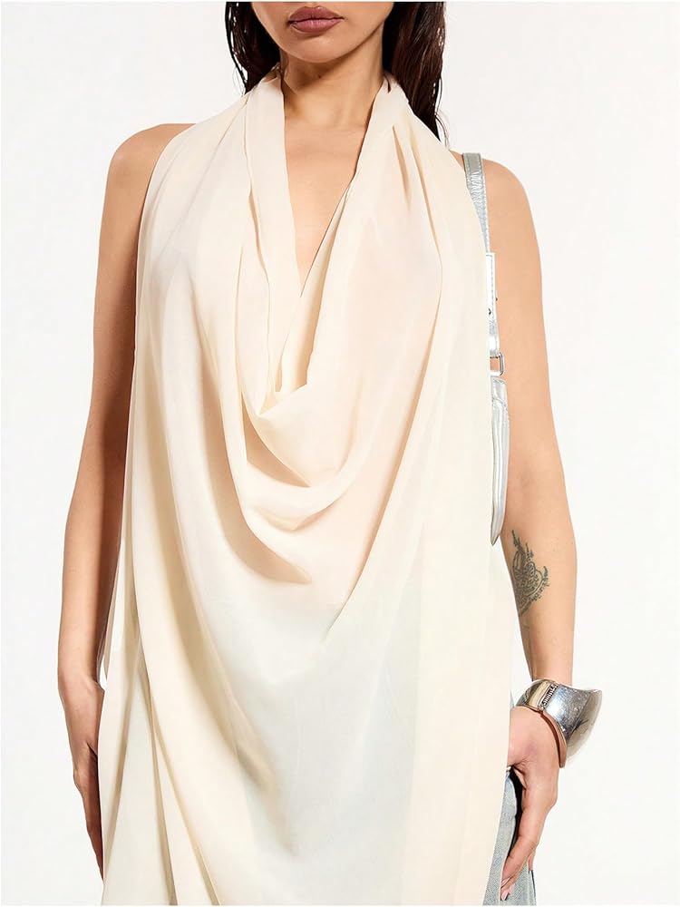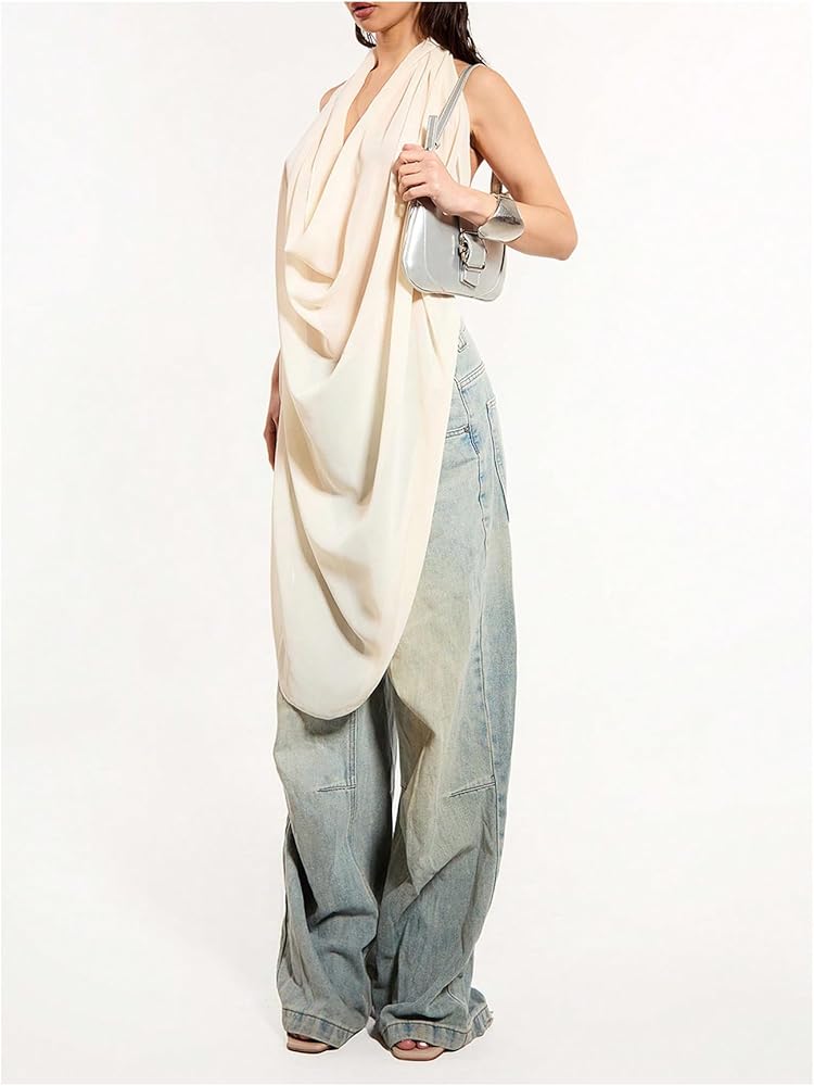 - التصميم: قمصان نسائية بدون أكمام ذات ثنيات تتميز بدون ظهر، رقبة على شكل بقر، بدون أكمام، مقدمة منسدلة، طول طويل