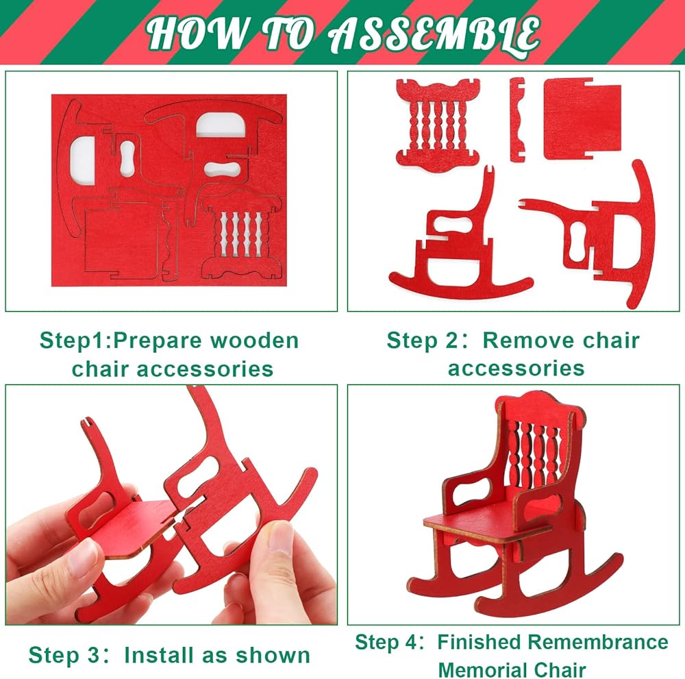 • Enjoy DIY Process: you can easily and quickly finish the assembling process of the empty rocking chair ornament according to the installation steps, then you can put it with the mini Christmas tree, shiny mini boxes, flickering LED candle inside the lantern, and fix the Christmas card near the lantern, to create an exquisite and creative visual effect, and you will also feel the sense of achievement and joy in the DIY process