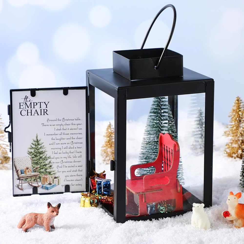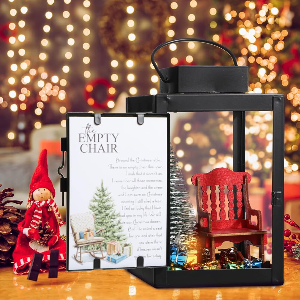 Roowest عيد الميلاد في السماء ديكور عيد الميلاد التذكاري فانوس كرسي هزاز فارغ مع شمعة LED شجرة عيد الميلاد الصغيرة صناديق لامعة زخرفة في ذكرى أحبائهم توفير مقعد هدية تذكارية DIY (13 قطعة)