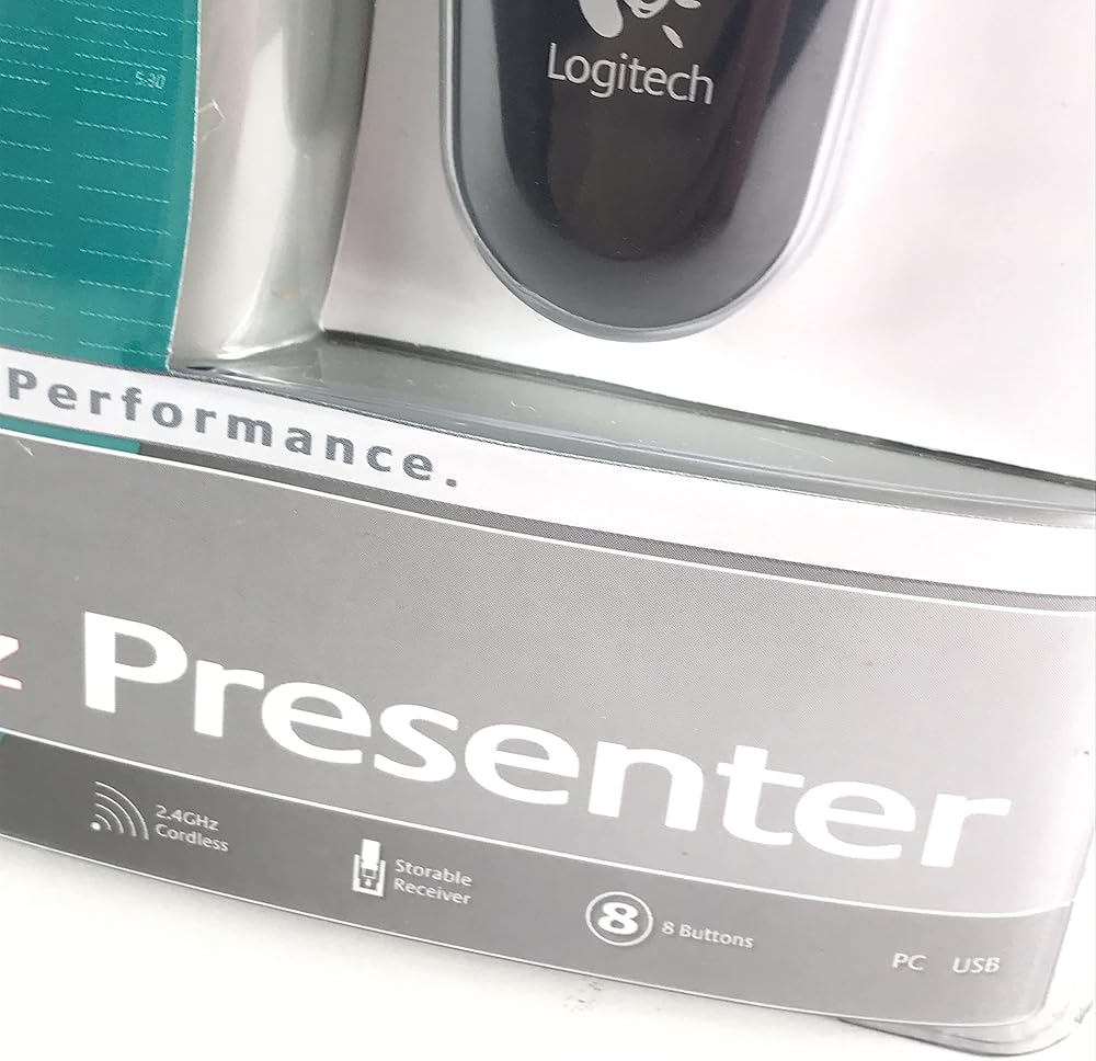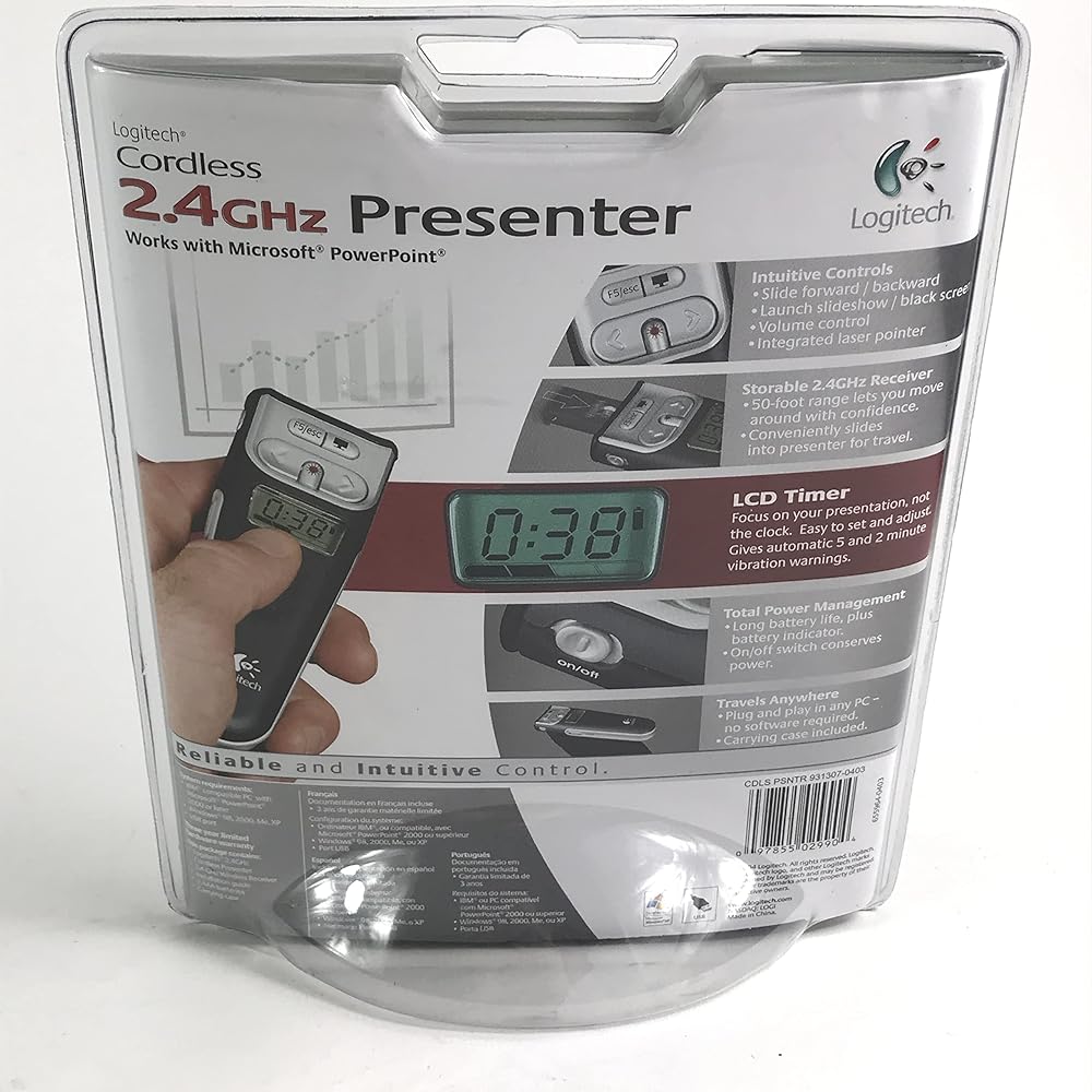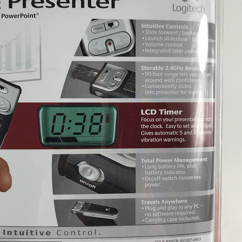 From the Manufacturer The Logitech Cordless 2.4 GHz Presenter helps you focus on connecting with your audience, not your computer. Take advantage of its 50-foot range to control your presentations while moving around an auditorium with confidence. A built-in LCD timer with vibration alerts at five and two minutes helps you effectively manage your time.