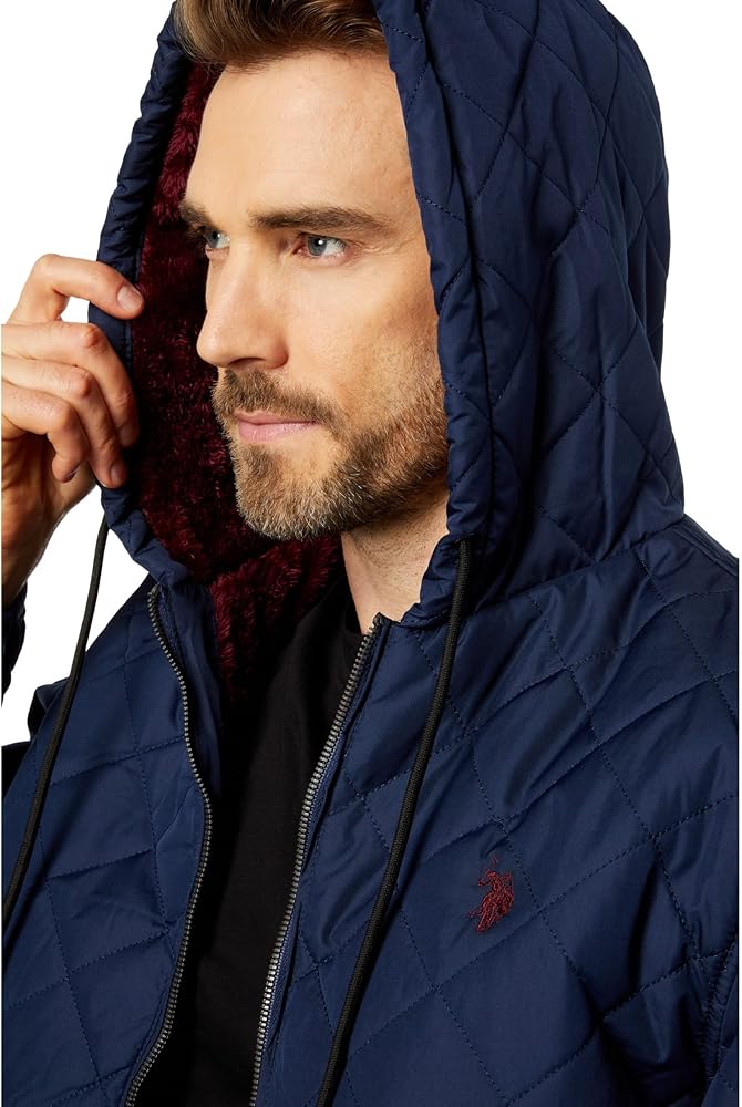 Get the classy bold look while going anywhere wearing U.S. POLO ASSN. Diamond Quilt Jacket. Hooded construction with attached drawcord. Long sleeves with elastic cuffs. Full zip closure. Signature brand logo on left chest. Two zipper pockets in fornt. Fleece lined. 100% polyester. Machine wash, tumble dry.