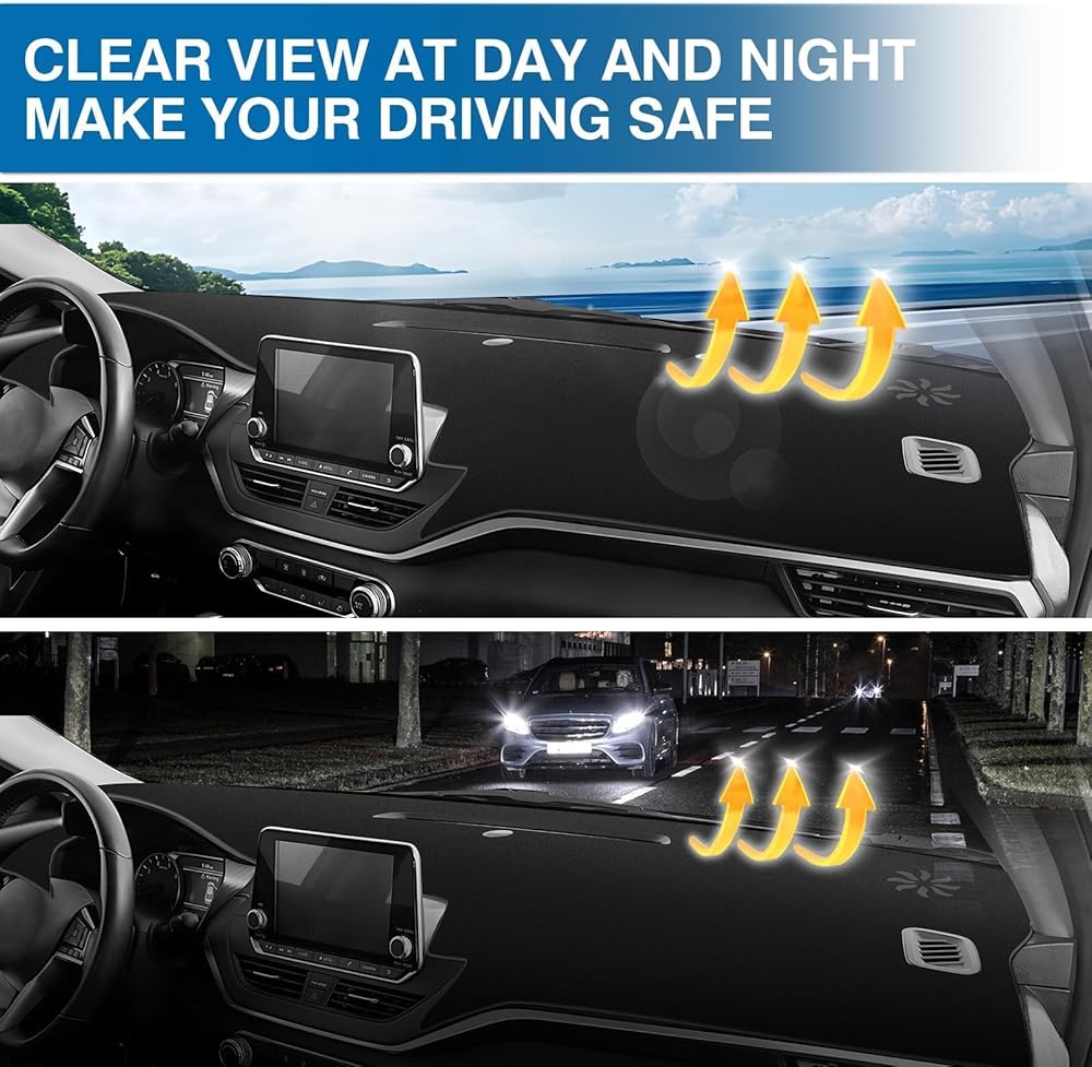[حماية فائقة] غطاء لوحة القيادة عالي الجودة المضاد للوهج خفيف وناعم ومقاوم للتشوه والبهتان والتجاعيد. يحمي سطح لوحة القيادة من الأشعة فوق البنفسجية. إنه يخفي الضرر الذي حدث بالفعل على لوحة القيادة الخاصة بك. يساعد أيضًا على تقليل وهج الزجاج الأمامي الخطير، مما يجعل القيادة أكثر راحة وأمانًا.