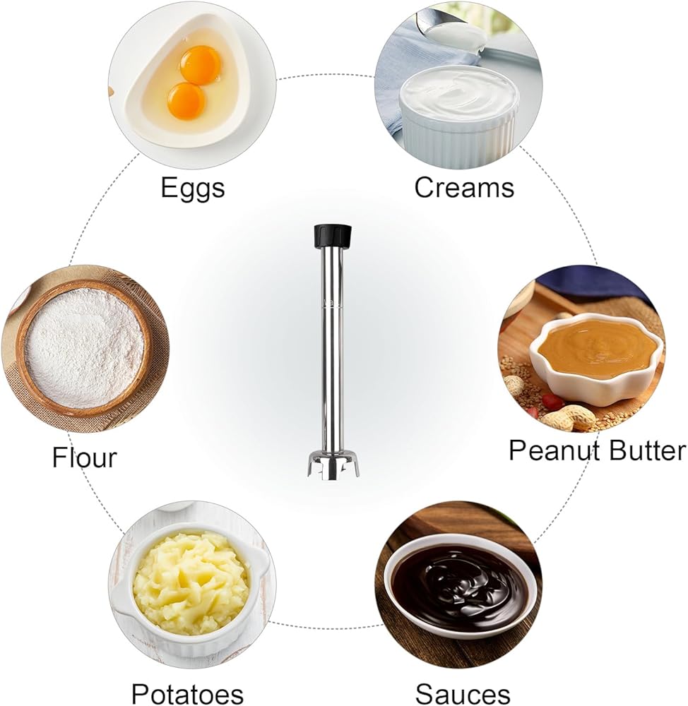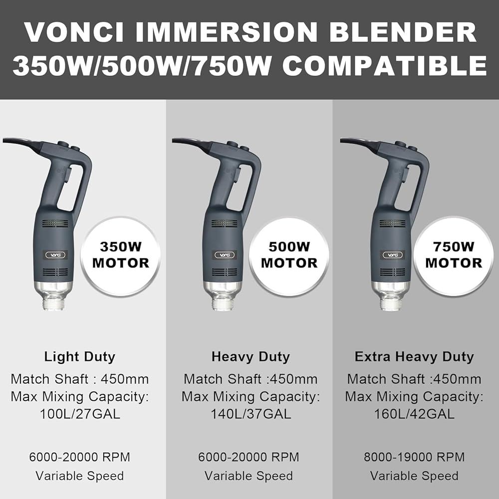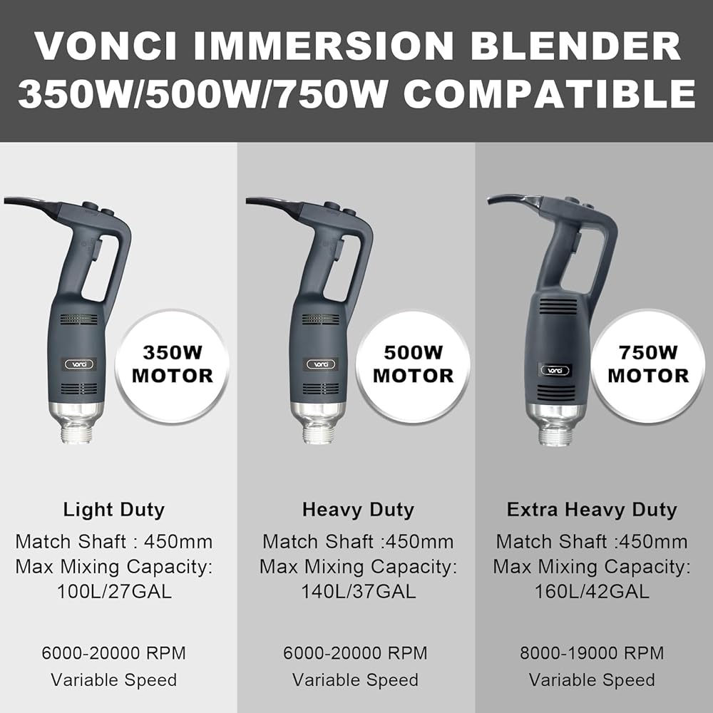 طاقة فعالة - يستخدم خلاط الغمر التجاري VONCI 120V محركًا نحاسيًا نقيًا بقدرة 500 وات لخلط المكونات بسرعة وتوفير الوقت. يتميز هذا الخلاط اليدوي الاحترافي بتنظيم سرعة متغير يتراوح بين 6000-20000، ويتم التحكم في السرعة عن طريق زر السرعة الموجود في الأعلى لتلبية احتياجاتك المختلفة.