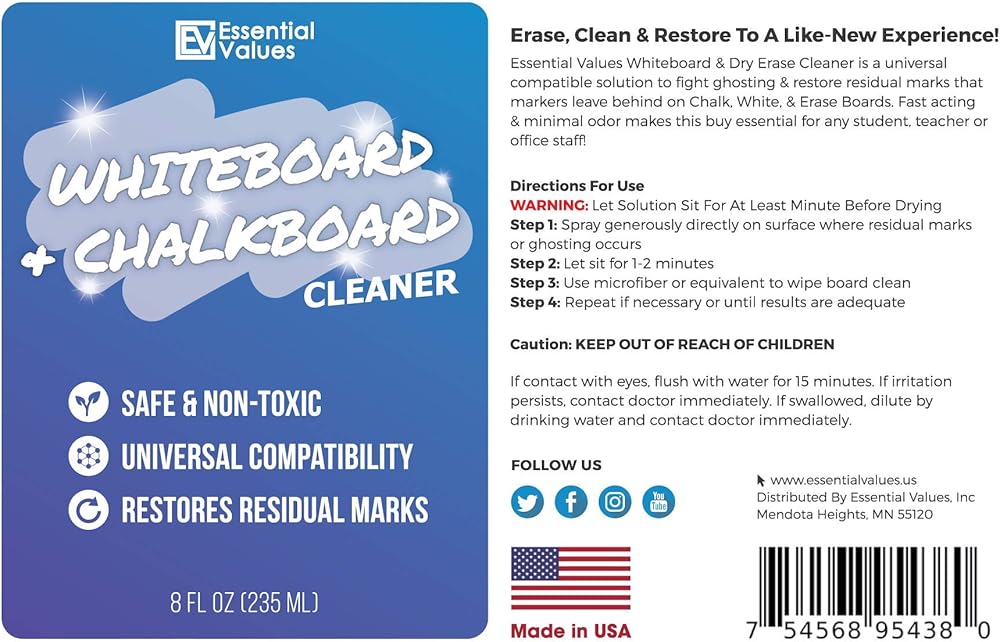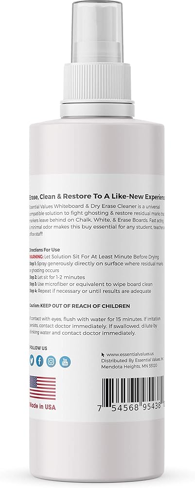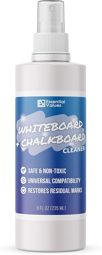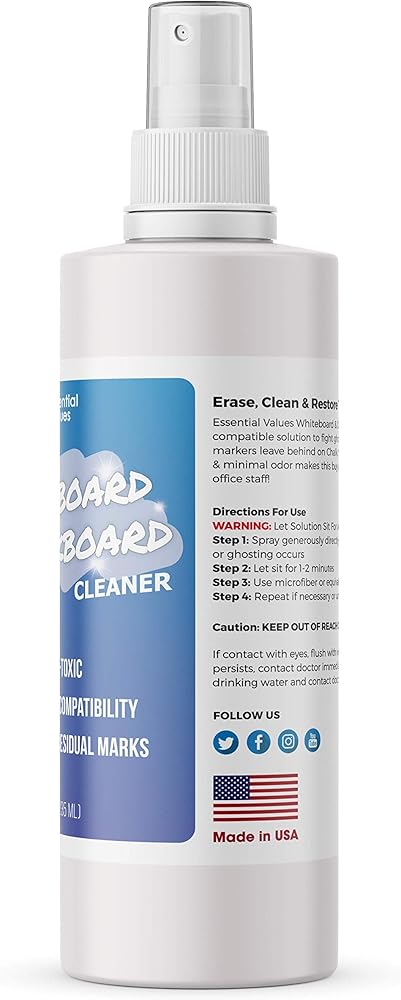 بخاخ منظف السبورة البيضاء (8 أونصة سائلة)، الأفضل لإزالة التظليل من ألواح المسح الجافة وسبورات الطباشير وأقلام الطباشير السائلة - آمن وغير سام، صُنع في الولايات المتحدة الأمريكية بواسطة شركة Essential Values (8 أونصة + ألياف)