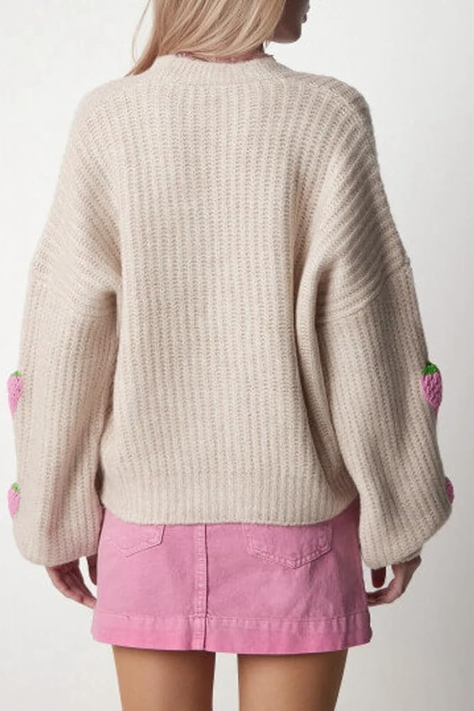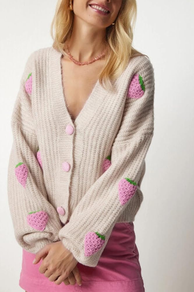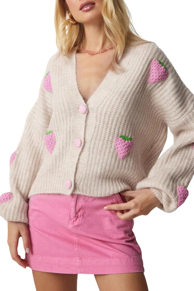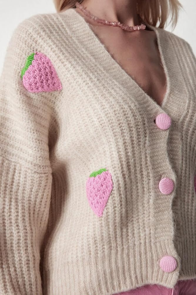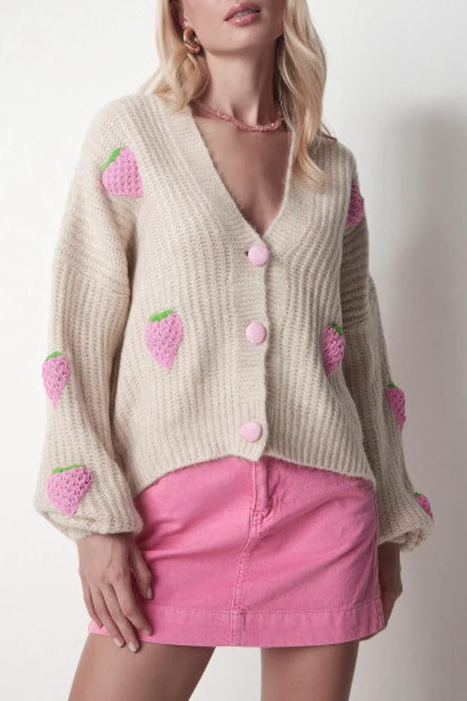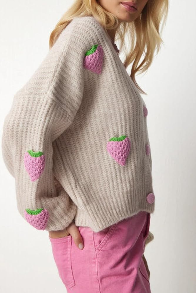 السمات: سترات صوفية خريفية للنساء، لون موحد، أكمام طويلة، سترات برقبة على شكل حرف V، سترات محبوكة مفتوحة من الأمام للنساء، سترة صوفية محبوكة عصرية، معطف خارجي بطباعة الفراولة، سترة مطرزة للنساء بمقاس فضفاض
