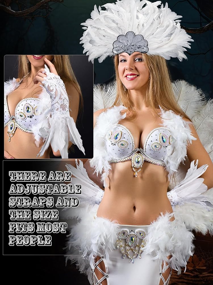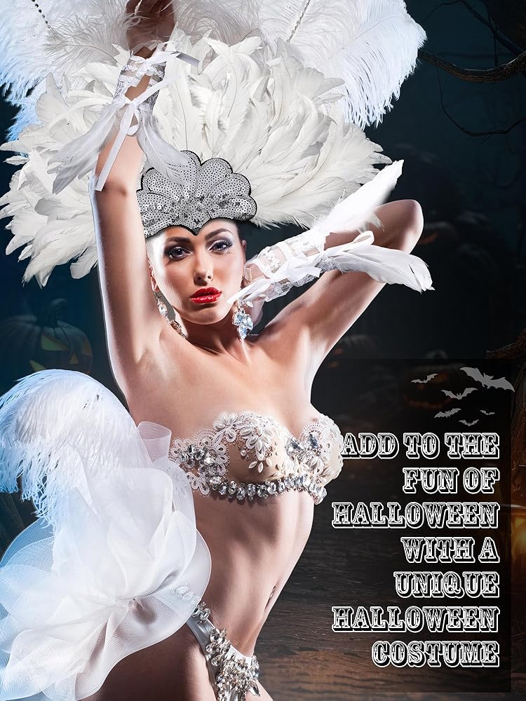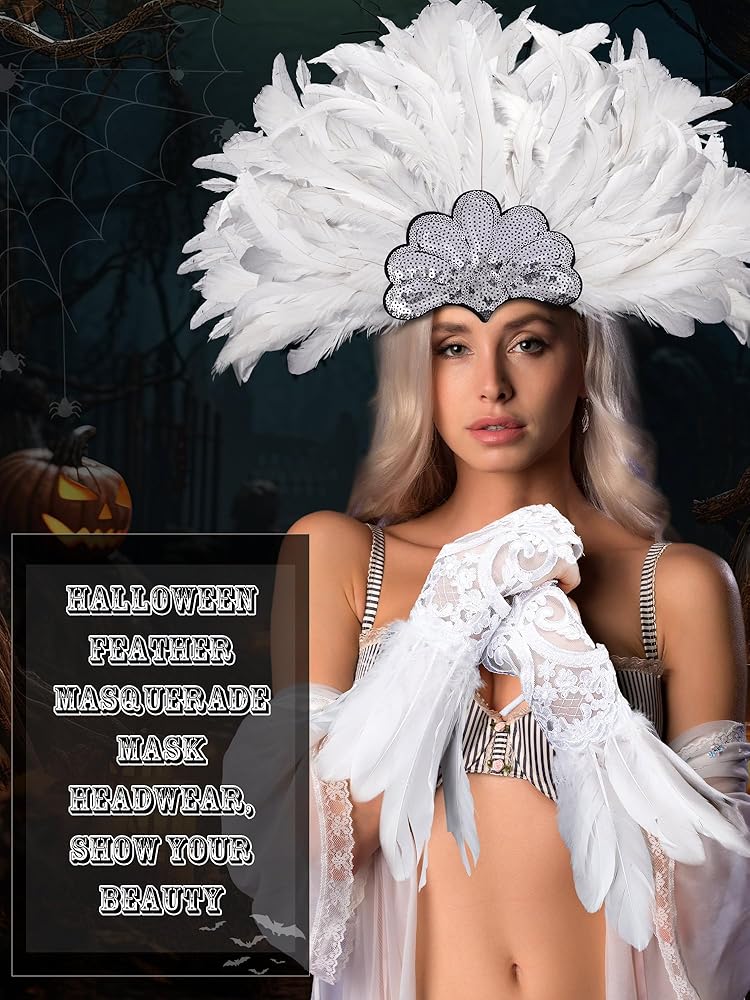 تصميم رقيق: تم تصميم غطاء رأس الكرنفال بالترتر والريش، ولافت للنظر وساحر، مما يجعلك تبدين أكثر أناقة وجاذبية؛ القفازات البيضاء الطويلة مصممة من الدانتيل والريش، جميلة وآسرة، مما يضيف إضافة لطيفة لمظهرك