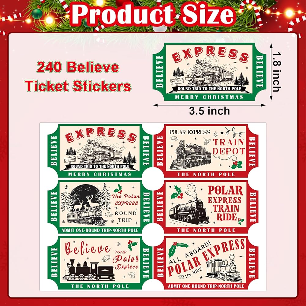 ما تحصل عليه - 240 قطعة من ملصقات التذاكر الملونة لعيد الميلاد القطبي السريع في 40 ورقة. مادة الملصقات ذاتية اللصق. 3.5 × 1.8 بوصة