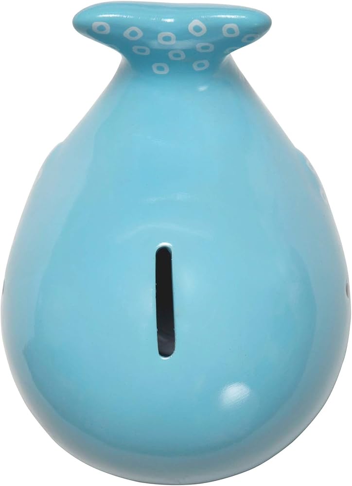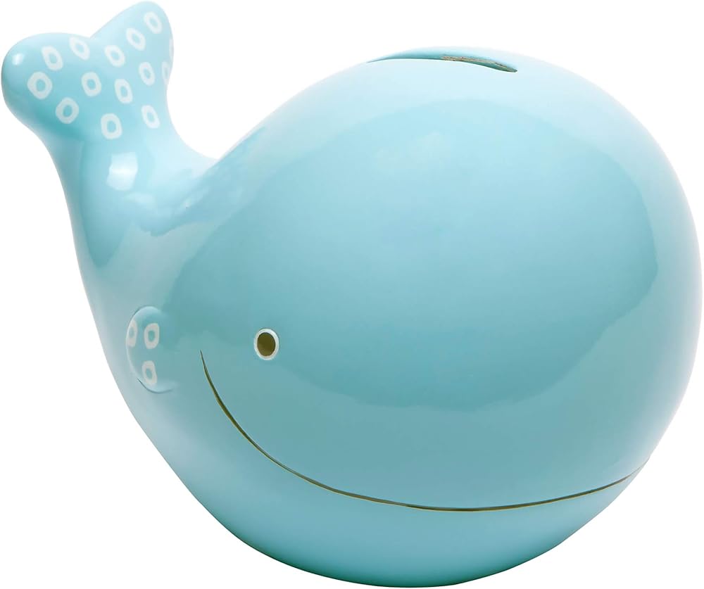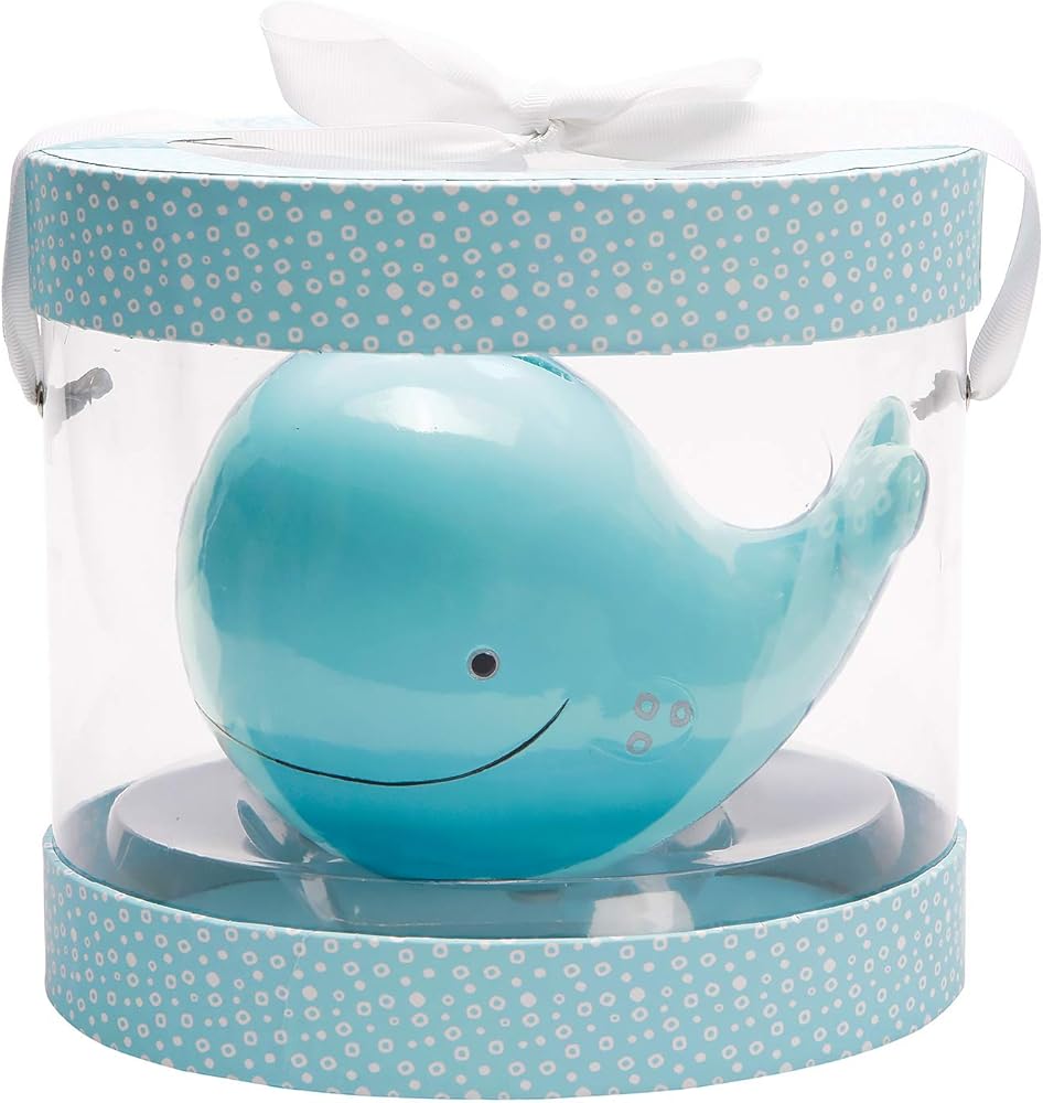 C.R. Gibson's Blue Whale shaped piggy bank is 6.5'' x 4.5'' x 4.5'' and comes beautifully packaged to be gifted to any expecting parents!. This baby shower gift is a very sweet way for a grandparent to start their grandbaby's college fund early. The matte finish makes this piggy bank a perfect addition to your child's nursery decorations.