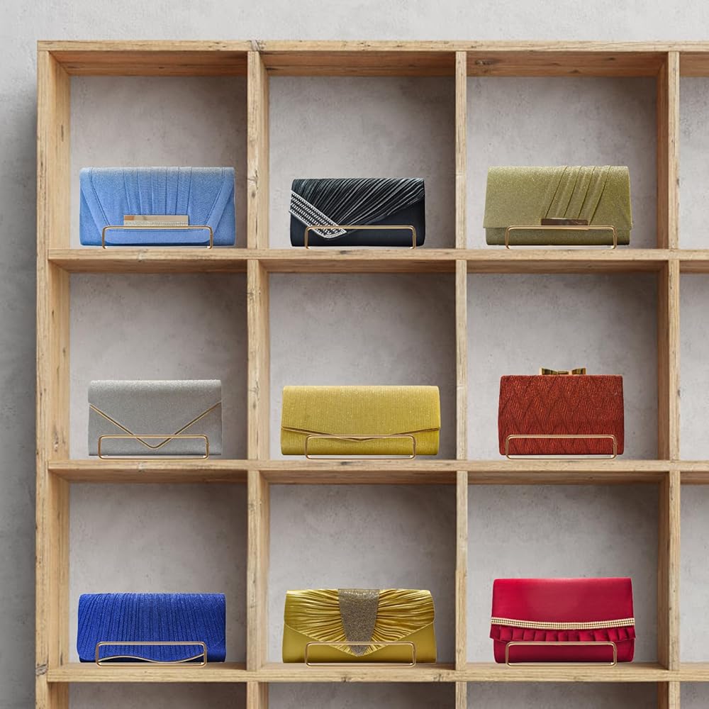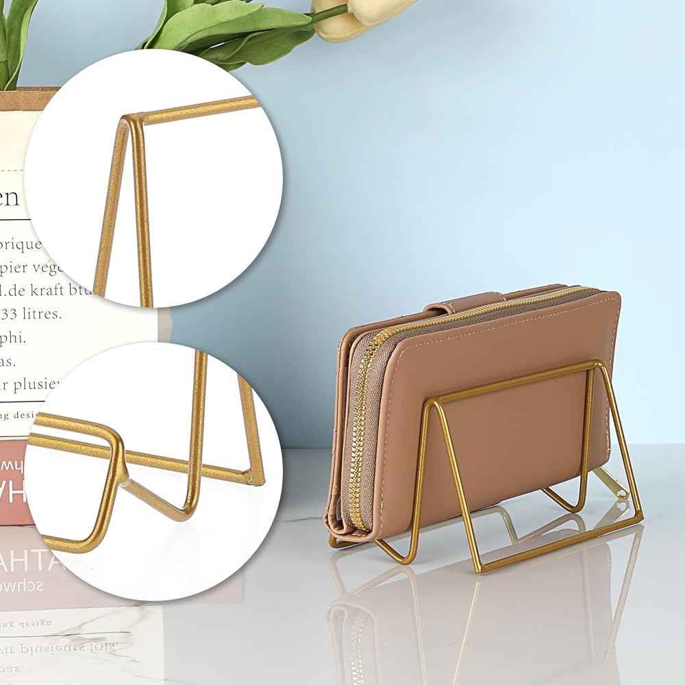 JUXYES حزمة من 6 حامل عرض المحفظة الذهبية، حامل عرض المحفظة المعدنية، حامل عرض حقيبة اليد وحقائب الكتف، حامل المحفظة للبوتيك، حامل عرض أكريليك على سطح البيع بالتجزئة لحقائب اليد والمحفظة