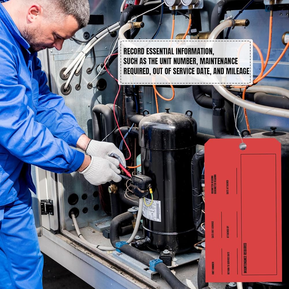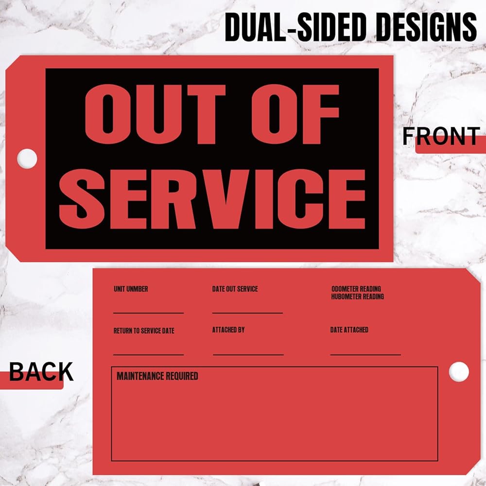 • CLEAR IDENTIFICATION FOR TIMELY WARNINGS:Our weatherproof inspection tags feature dual-sided designs. On one side, bold black text on a red background prominently displays the phrase 'OUT OF SERVICE.' On the other side, you have ample space to record essential information, such as the unit number, maintenance required, out of service date, and mileage.