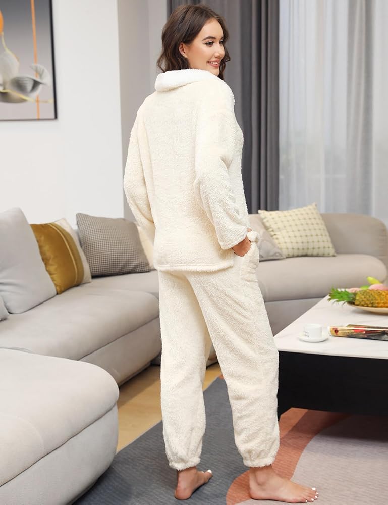 【مجموعة بيجامة طية صدر السترة】: تتميز بيجامات الصوف النسائية بتصميم طية صدر السترة للحفاظ على دفء رقبتك. حزام خصر مرن وتصميم فضفاض يجعل من السهل ارتداؤه وخلعه. الجيوب الموجودة على كلا الجانبين مناسبة لتدفئة اليدين أو تخزين الأشياء مثل الهواتف وتحرير اليدين. توفر أطقم البيجامات النسائية راحة لا مثيل لها في الطقس البارد. عندما تريد تمشية كلبك أو التسكع، فإن مجموعة البيجامات المريحة هذه للسيدات هي خيار رائع.
