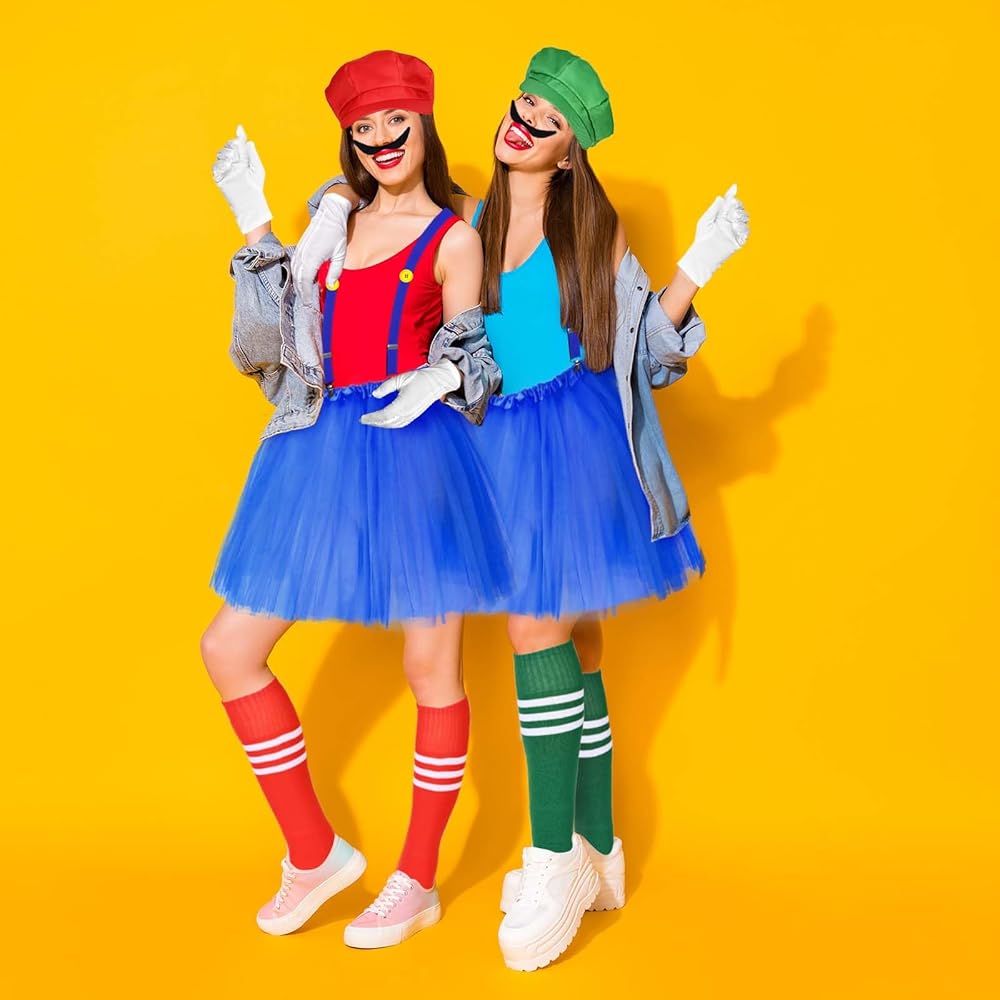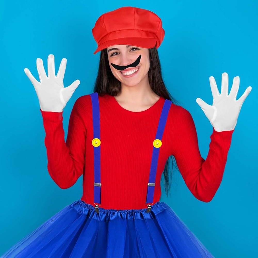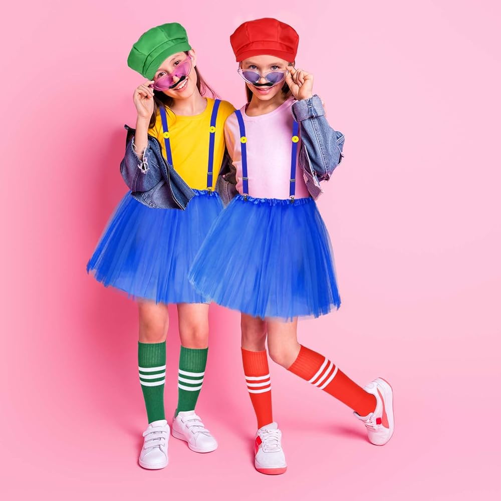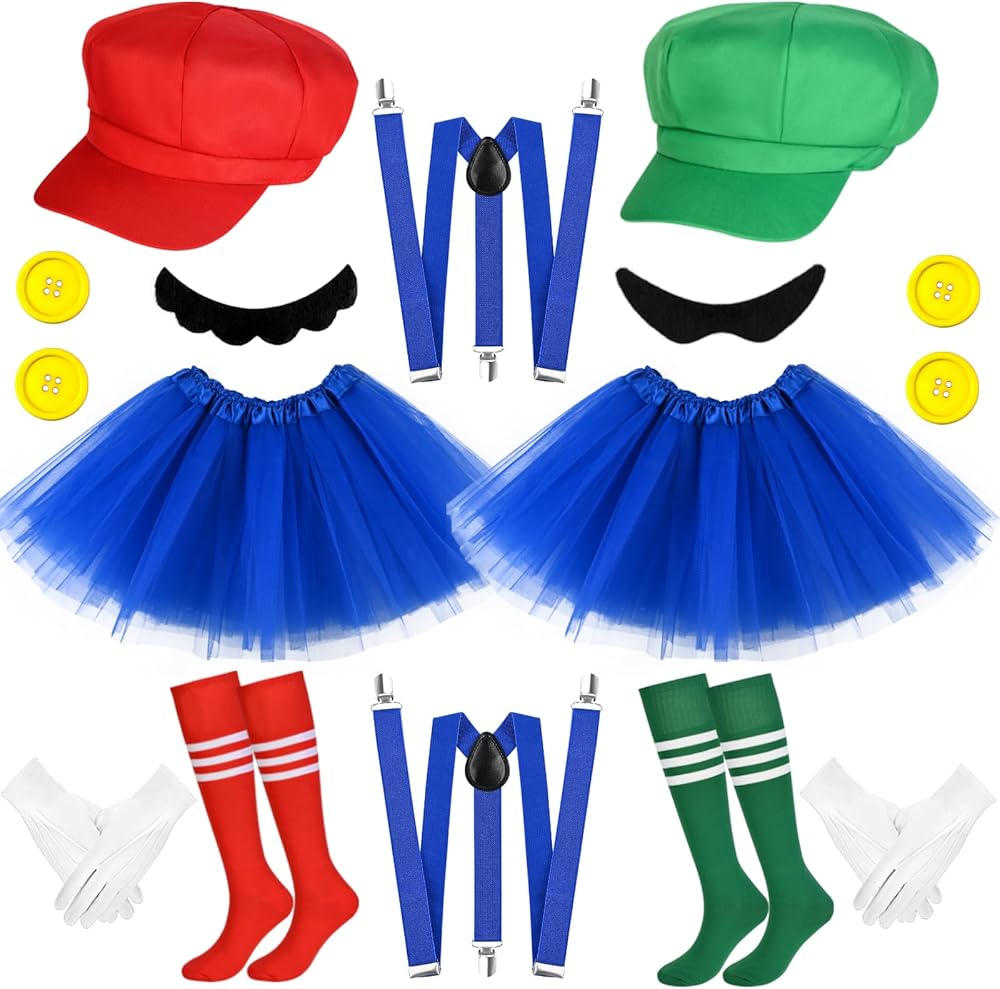 【Halloween Costume Accessories】you will receive 2 pieces plumber hats,2 pieces of tutu skirts,2 pieces of suspenders,2 pair of knee socks,2 sheet fake beards,2 pairs of gloves and 4 pieces of buttons,ideal combination for you to wear,great supplement for your Halloween costume .Wearing them on various party and it will make you eye catching in the crowd,you can also share them with your friends.
