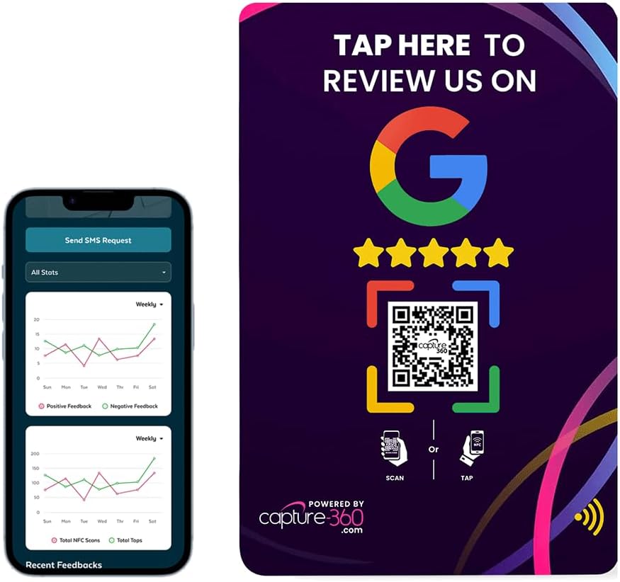 • جمع ردود الفعل المبتكرة - تُحدث بطاقة مراجعة Google للأعمال Capture 360 ​​NFC ثورة في كيفية جمع الشركات للتعليقات. بمجرد النقر على البطاقة بأجهزتهم التي تدعم تقنية NFC، يمكن للعملاء الوصول بسرعة إلى صفحتك، مما يجعل مشاركة تجربتهم أسهل من أي وقت مضى باستخدام ميزة بطاقة مراجعة Google للأعمال.