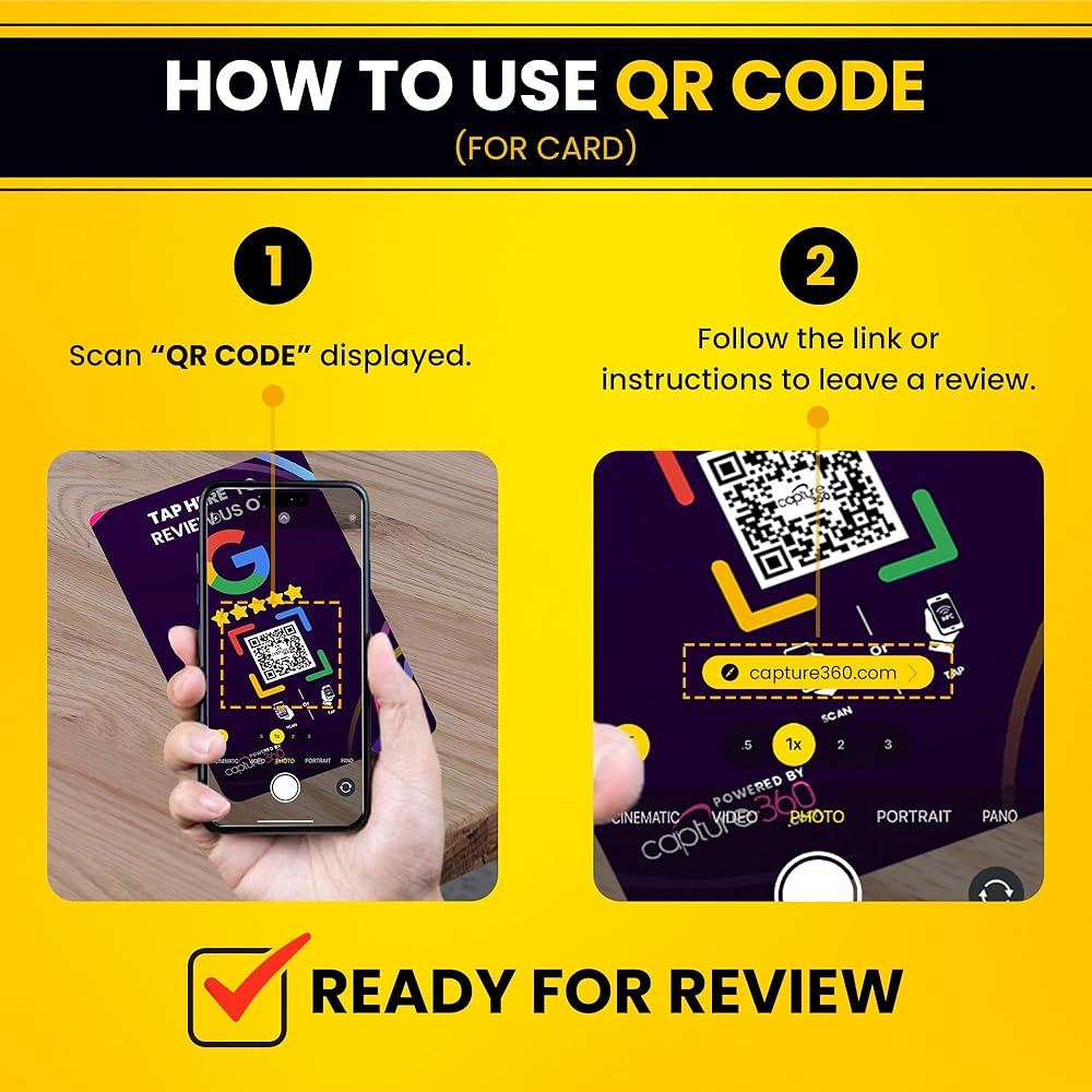 • إعداد سريع وسهل خلال دقيقة واحدة: يعد إعداد بطاقة مراجعة Capture 360 ​​NFC أمرًا في غاية السهولة! ما عليك سوى النقر للتسجيل باستخدام تطبيق Capture 360 ​​للهاتف المحمول، دون الحاجة إلى مهارات تقنية. 📲 بالإضافة إلى ذلك، استمتع بوظائف مدى الحياة دون اشتراك! بالنسبة لأولئك الذين يريدون ميزات إضافية، يوفر اشتراك RMS الاختياري الخاص بنا إدارة مراجعة متقدمة، ولكنه اختياري تمامًا. ابدأ في ثوانٍ وابدأ في تعزيز تقييماتك دون عناء!