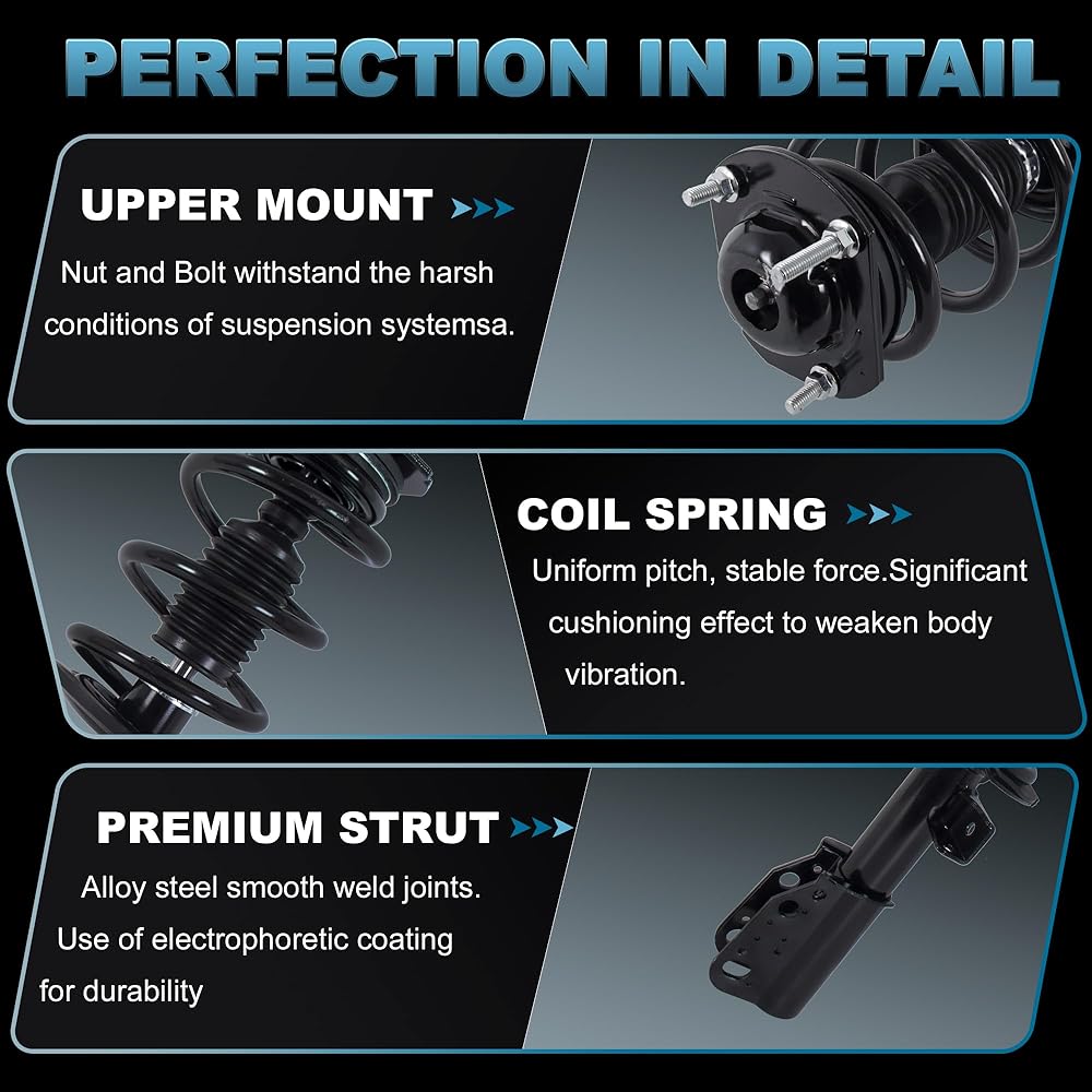 • وظيفة الدعامات/الصدمات: تتميز مجموعة الدعامات بقضبان مكبس من الكروم مع دعامات وتركيبات OE لمنع التسرب. تضمن الأكمام غير الملحومة انزلاقًا سلسًا، كما يوفر الزنبرك اللولبي الفولاذي امتصاصًا عاليًا للصدمات، وتقليل الضوضاء، وتحسين استقرار تشغيل السيارة، وتقليل تآكل السيارة، وتجربة قيادة أكثر راحة وأمانًا.