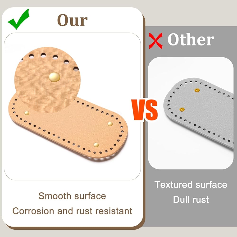 【قاعدة مسمار للحقيبة】تحتوي كل قطعة سفلية من المحفظة المخصصة للكروشيه على 4 مسامير من سبائك الزنك عالية الجودة، معروفة بمقاومتها الممتازة للتآكل واحتمالية منخفضة للصدأ. تم تصميم استخدام الأزرار لمنع الاتصال المباشر بالقاعدة الجلدية، مما يقلل من التآكل ويطيل العمر الإجمالي للمحفظة.