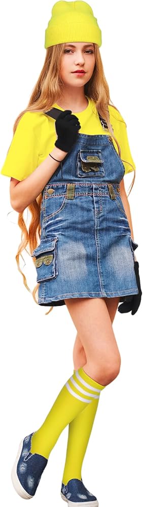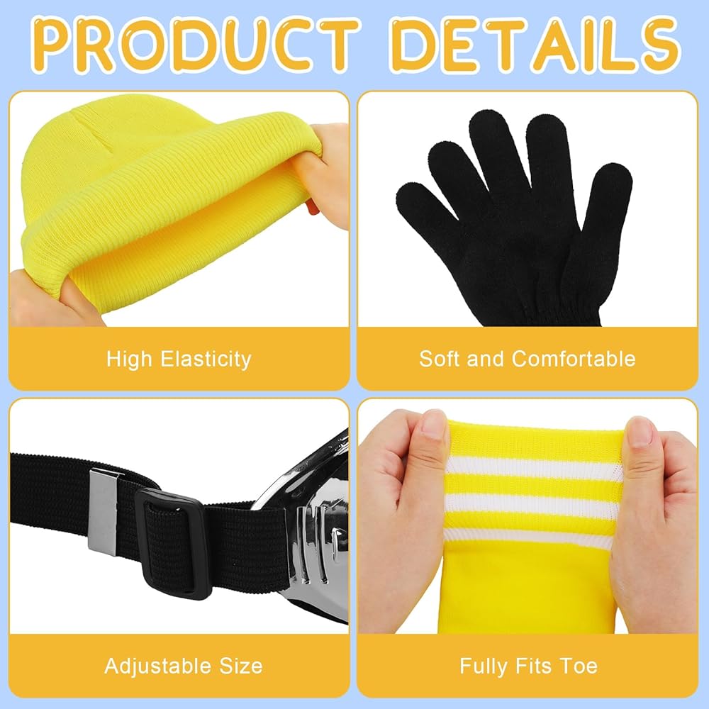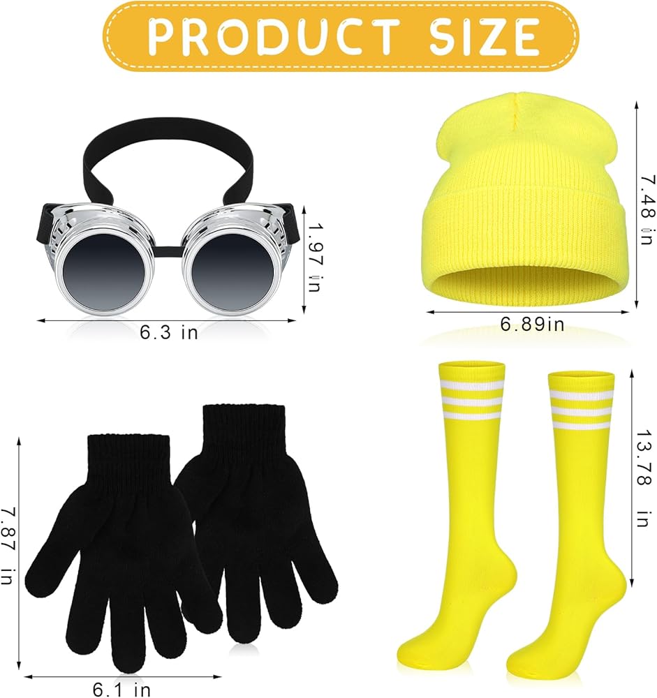 • Proper Dimension: the hat is approximately 6.89 x 7.48 inches/ 17.5 x 19 cm and the goggles are about 6.3 x 1.97 inches/ 16 x 5 cm, the yellow knee high socks are about 13.78 inches/ 35 cm in tube height, while the gloves are about 7.87 x 6.1 inches/ 20 x 15.5 cm