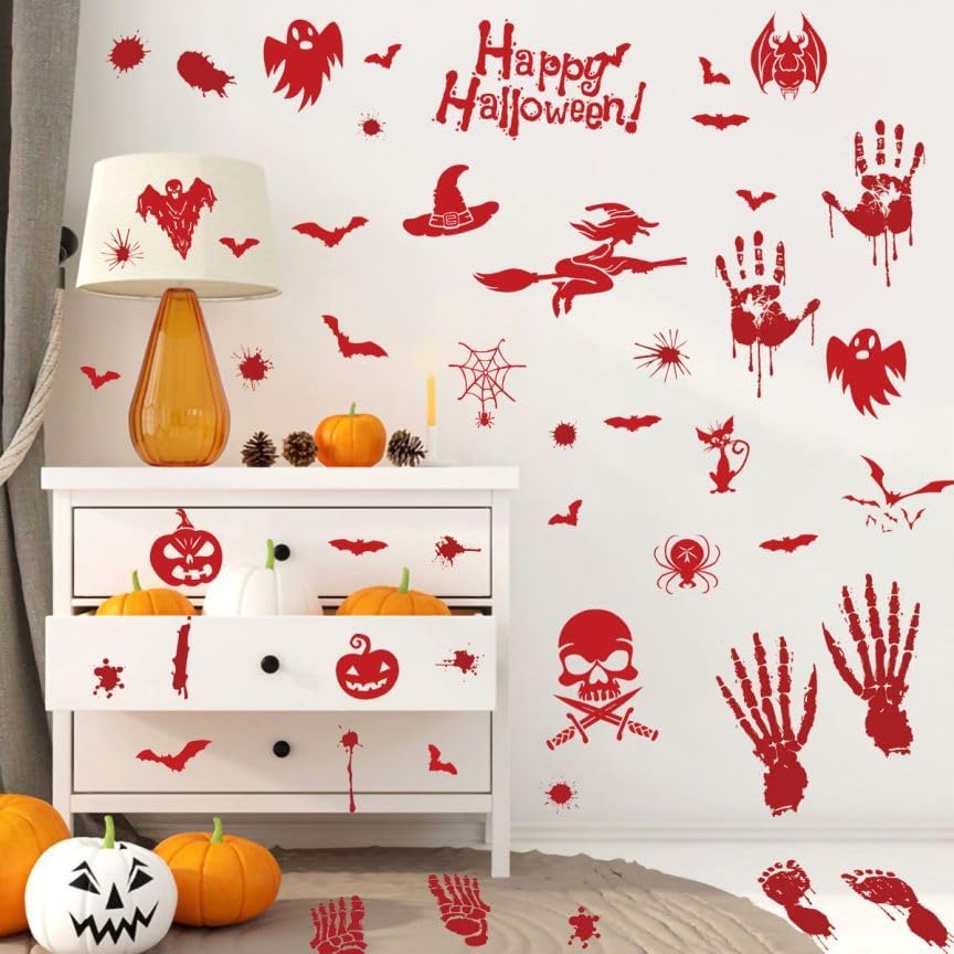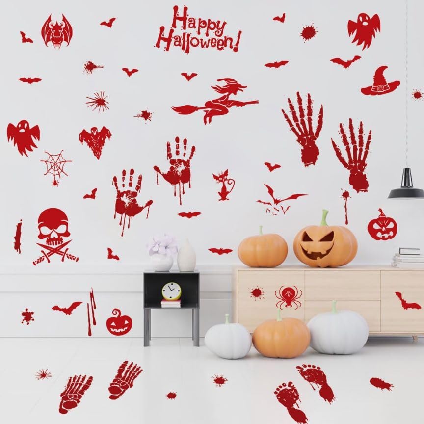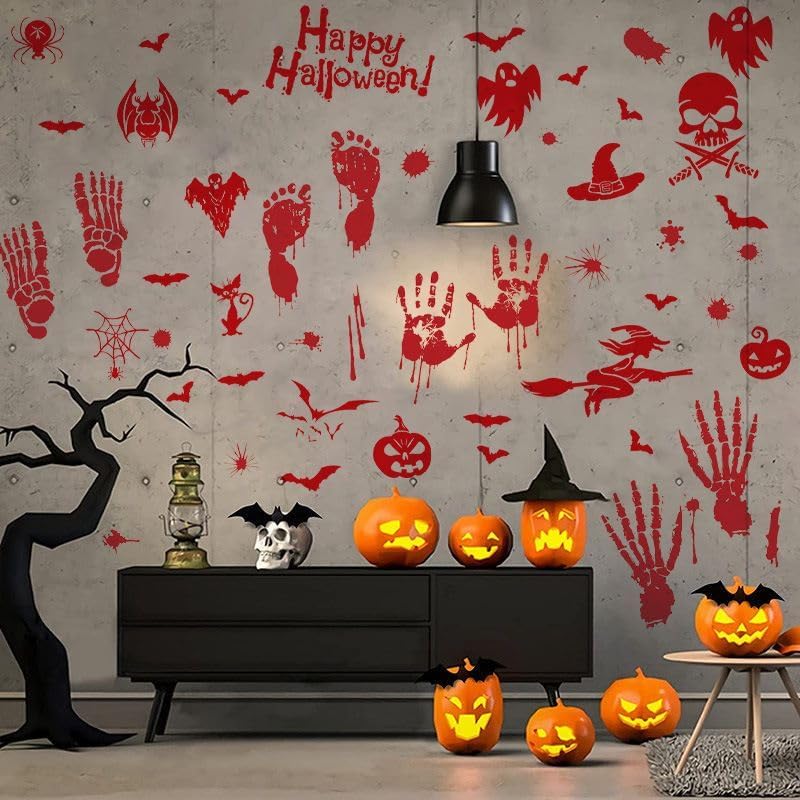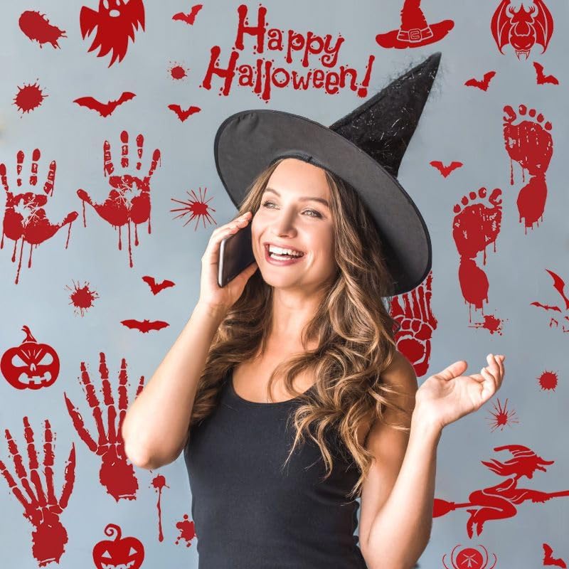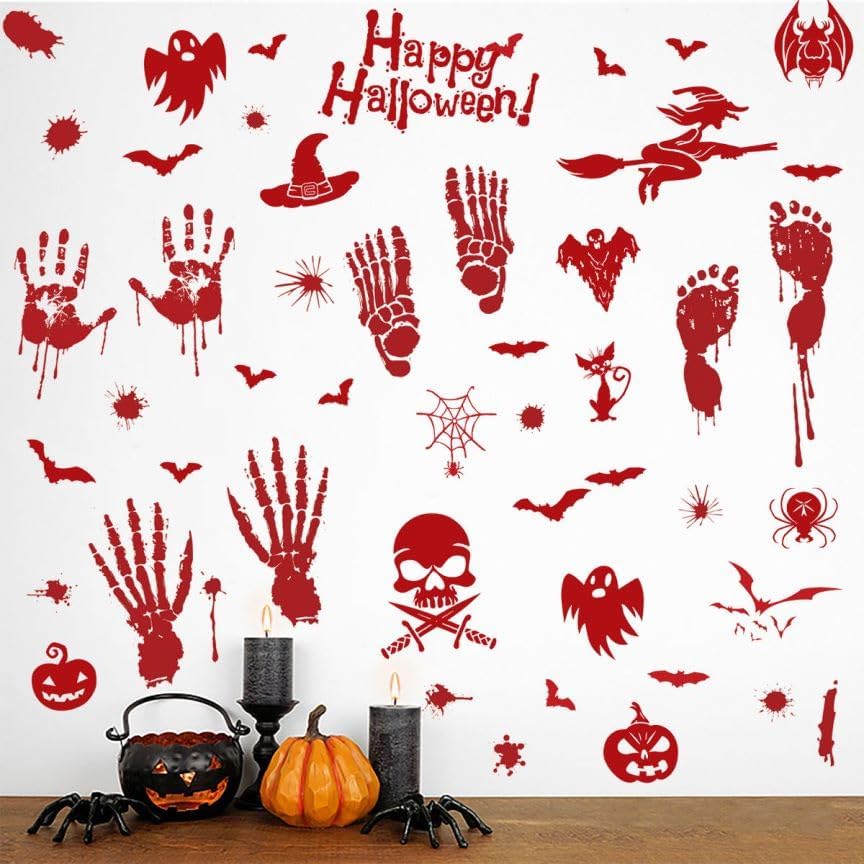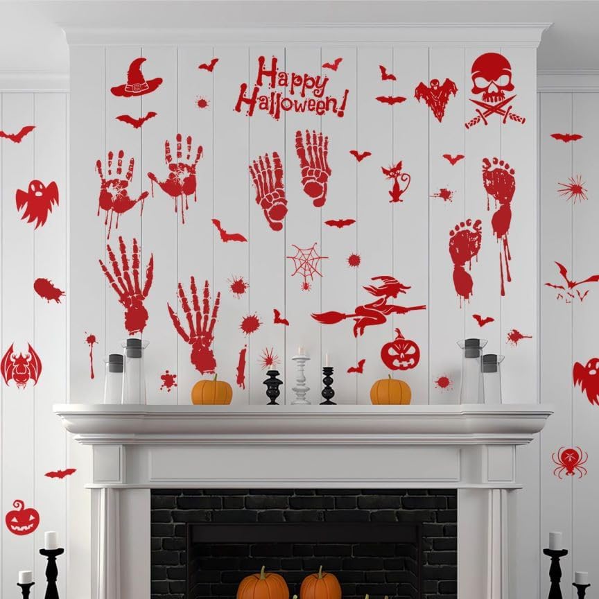 Products Included : 4 sheets bloody handprint footprint Halloween decorations stickers, totally 54pcs. Each sheet measures 9.8in×13.8in(25×35CM).