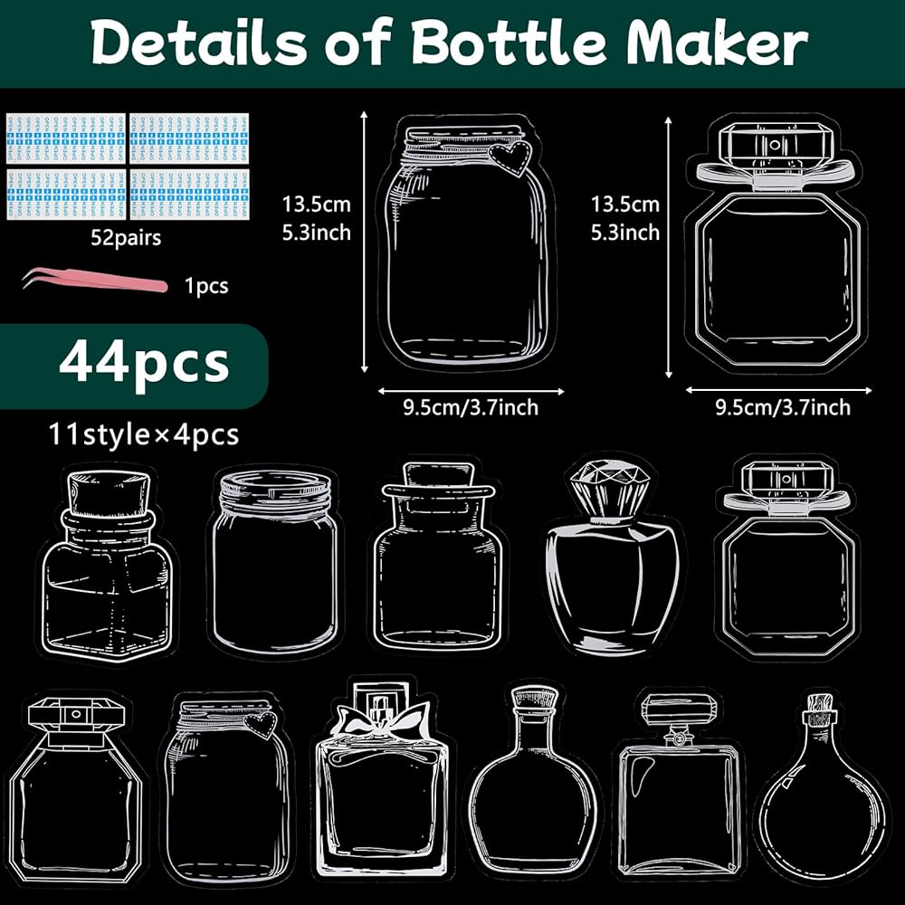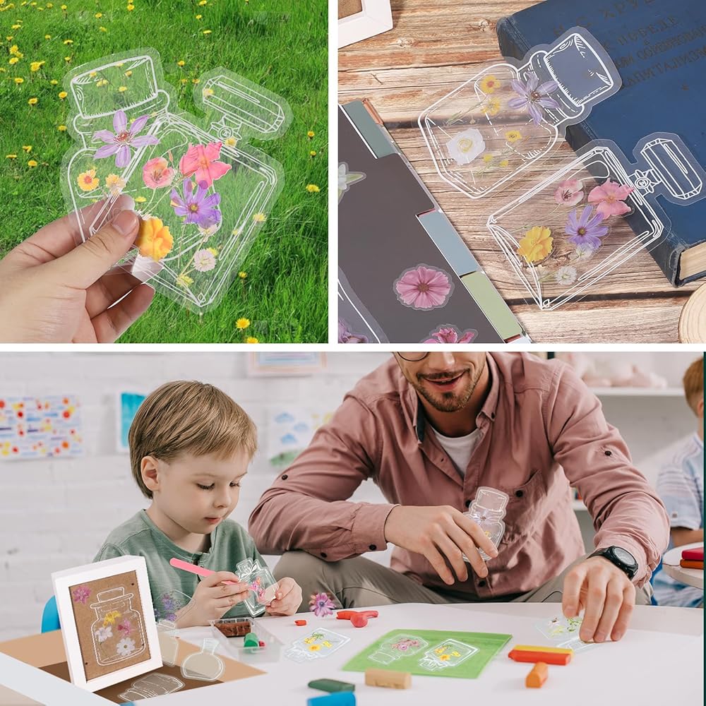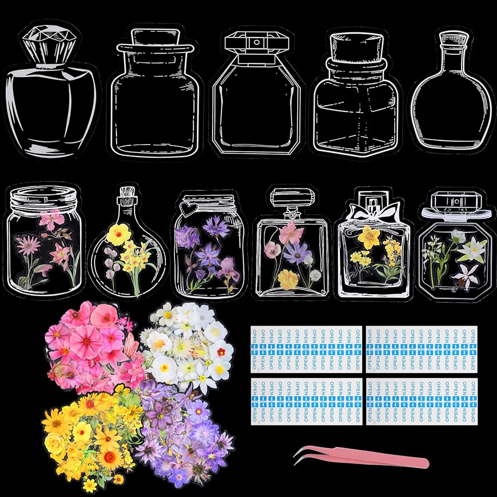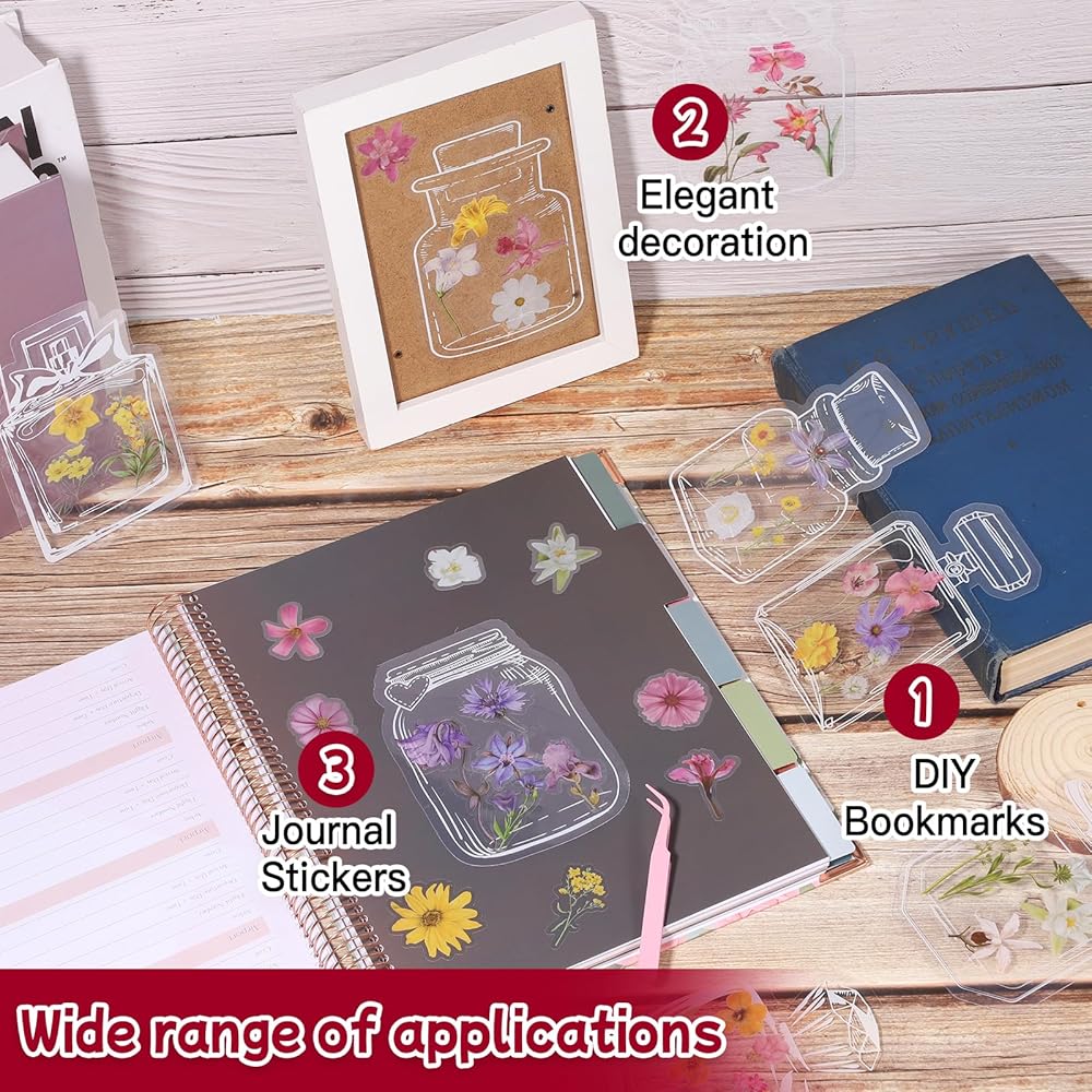Complete Set: The clear flower bookmark set contains 10 kinds of 48 pcs transparent wishing bottles, 240 pcs of dried flower stickers in 4 styles, 4 "open" stickers, 1 pair of tweezers, convenient and easy DIY, sufficient quantity to meet daily decoration and bookmarks need.