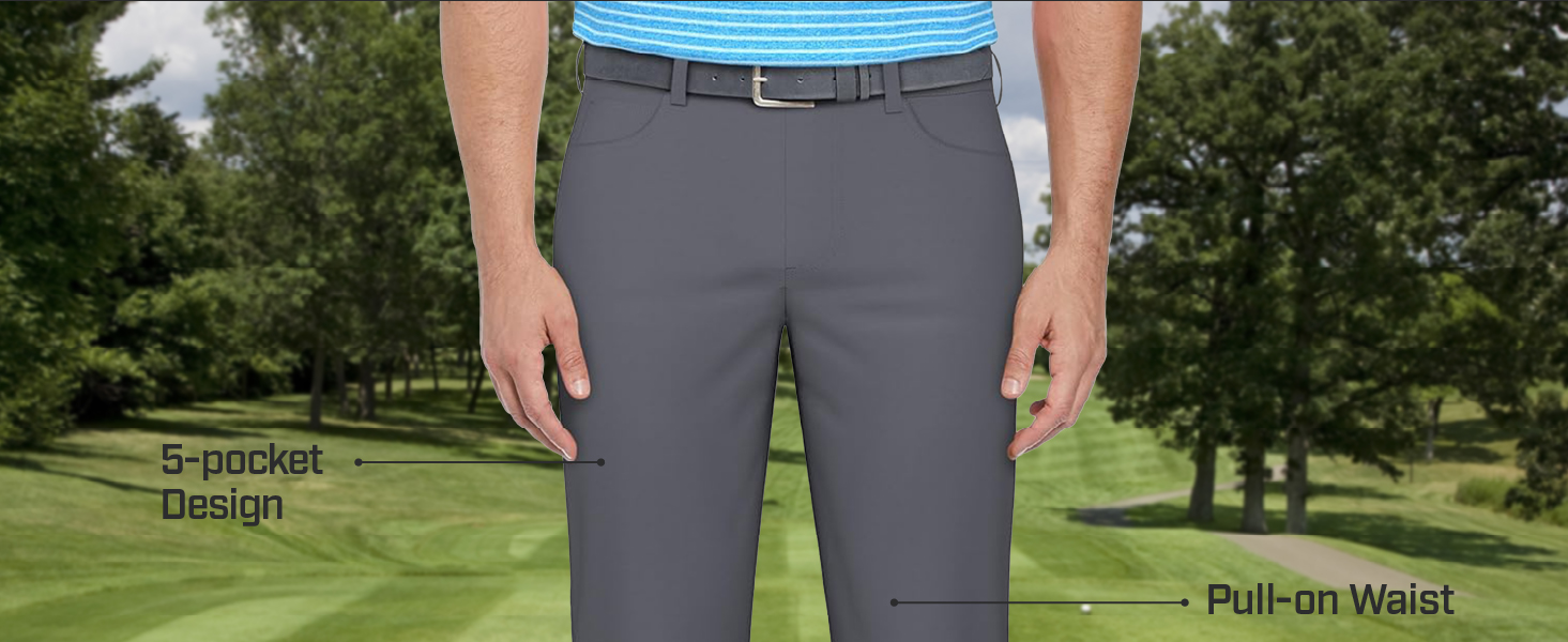 PULL-ON WAISTBAND: These 5-pocket golf pants feature a comfortable pull-on waistband design which makes them easy to gear up for the green quickly, while a good amount of stretch in the material allows you to swing, bend and crouch in total comfort.