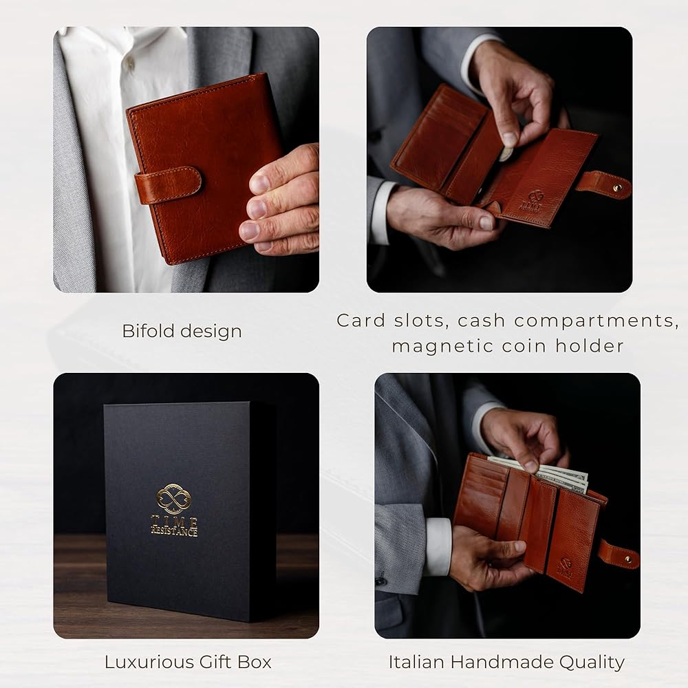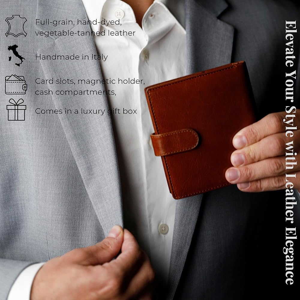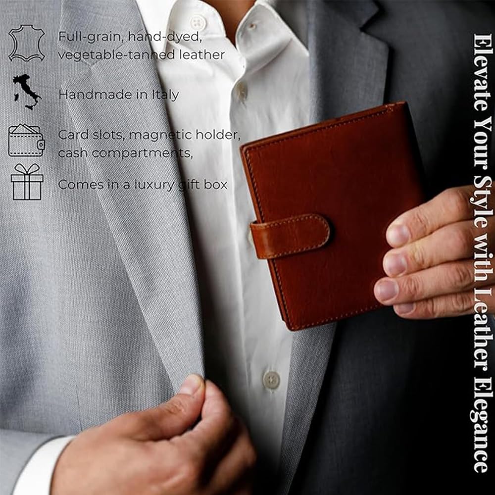 جودة دائمة: الجزء الخارجي للمحفظة مصنوع من جلد البقر الإيطالي المحبب بالكامل، بينما الجزء الداخلي مبطن بنسيج ناعم مقاوم للتمزق. تتميز المحفظة بلمسة نهائية وجودة لا تشوبها شائبة، وتمزج بسلاسة بين الأسلوب والعملية.