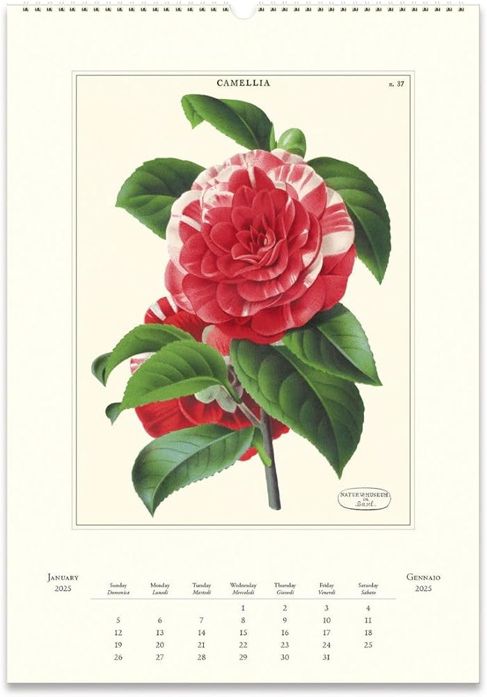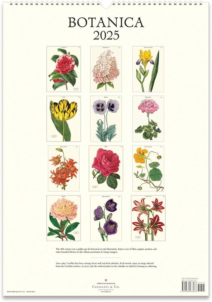 From Cavallini, this large 13 x 19 inch wall calendar features colorful vintage-inspired images of botanica. Printed on archival-quality Italian paper with a vintage look, the pages are suitable for framing and are spiral bound.