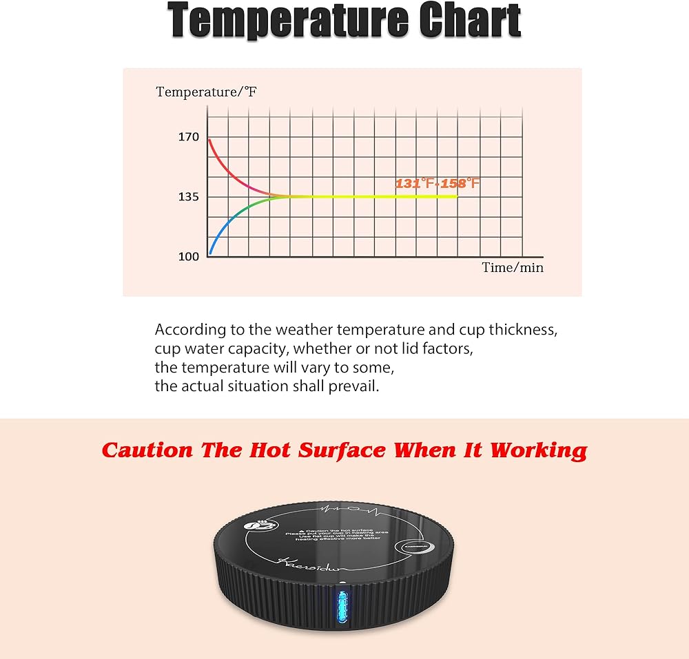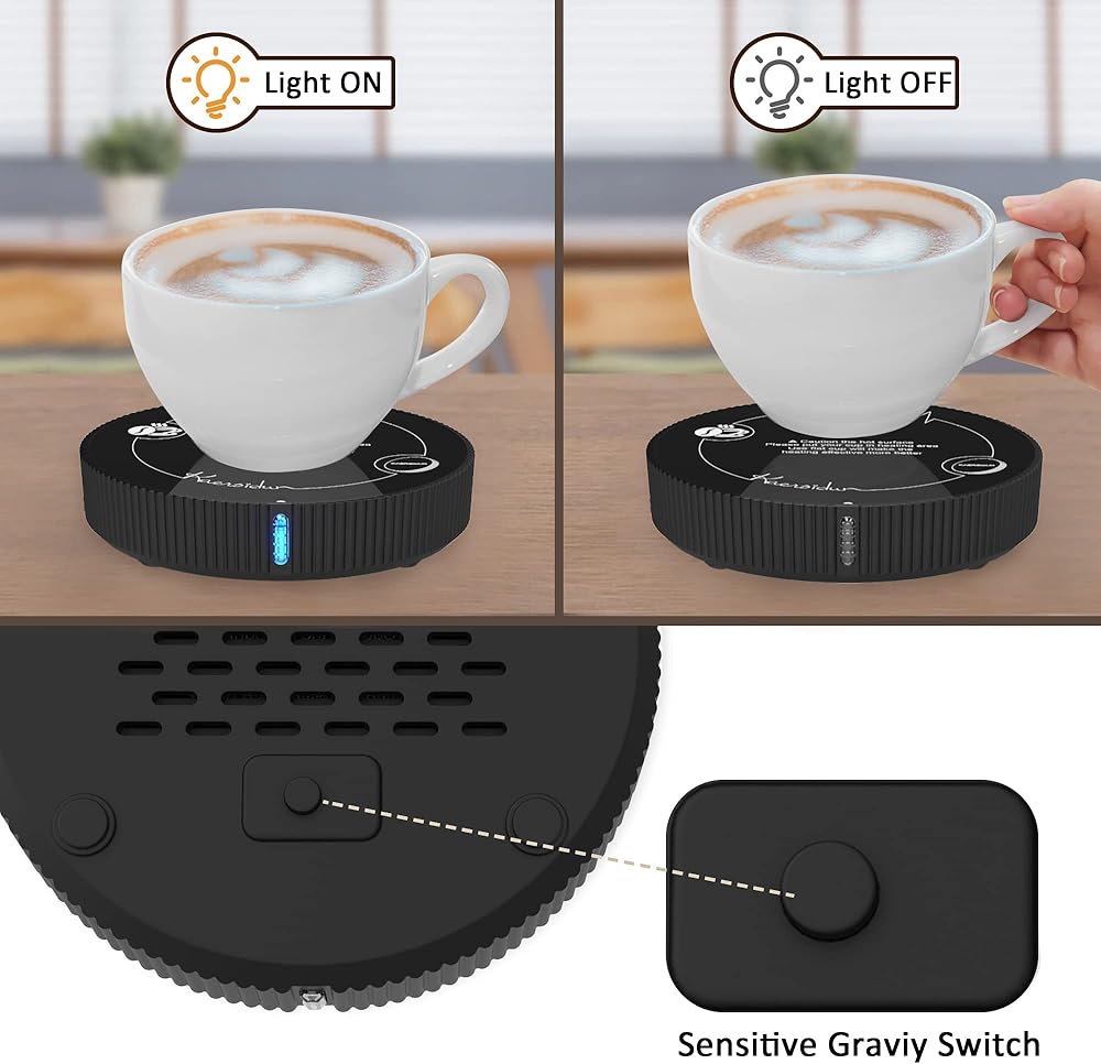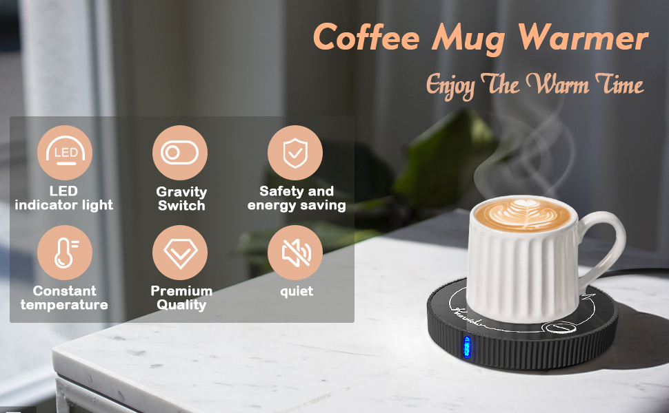 [تصميم أنيق وبسيط]: سخان أكواب خفيف الوزن ومحمول لا يشغل مساحة كبيرة ويسهل حمله معك في أي مكان تذهب إليه. لا يحتاج المفتاح الحساس للجاذبية إلى لمسه يدويًا، ويوجد عناصر تصميم مسامية لتبديد الحرارة في الأسفل. يتم تسخينه بهدوء، وهو رفيق رائع للتجمعات غير الرسمية أو العمل أو الدراسة، ويحافظ على مشروبك دافئًا من أول رشفة إلى آخر قطرة.