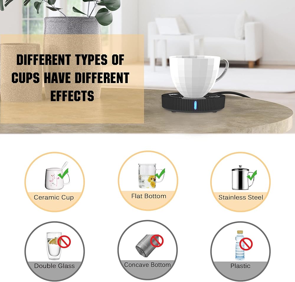 [اقتراح كوب مطابق]: قم بتوصيل الطاقة، ضع قدبك على جهاز تسخين الكوب وسيعمل جهاز التسخين تلقائيًا للحفاظ على مشروبك دافئًا. إن جهاز تسخين فنجان القهوة هذا مناسب للأكواب الزجاجية، والأكواب المصنوعة من الفولاذ المقاوم للصدأ، وأكواب السيراميك، وعلب الحليب الكرتونية، وما إلى ذلك. واستخدام الكوب المسطح أو الرفيع سيعطي أفضل النتائج. ولكنها غير مناسبة للأكواب السميكة أو أكواب الكونجا أو الأكواب ذات القاعدة المزدوجة والأكواب الحرارية.