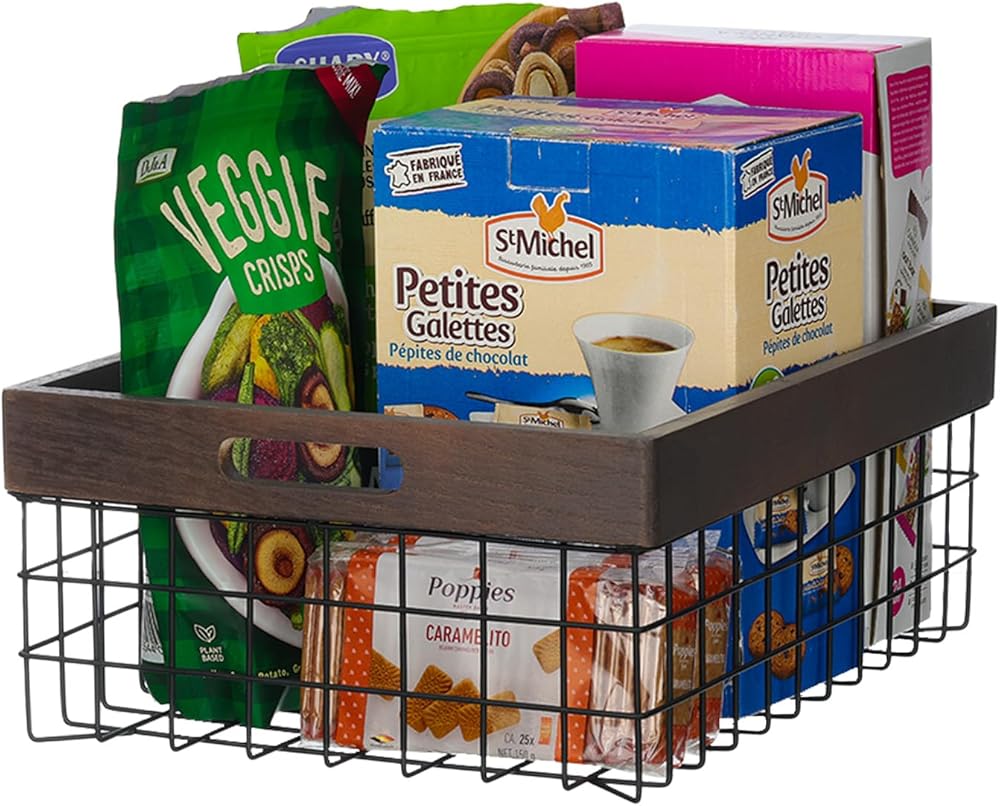 Our pantry storage bins are the perfect way to organize your pantry and keep it looking chic. Not only do they add storage, but they also come in three different sizes so you can find the perfect fit for your needs. Sturdy Wire Baskets Nest Inside for Compact Storage This set of three pantry baskets are designed to nest inside of each other when not in use. Each wire basket comes with a rustic wood trim around the top that has handles cut in them to make them easy to carry. Endless Organization Options for Every Room While they are ideal for keeping the pantry organized, our storage baskets are the perfect set of baskets to tidy up any room. On kitchen countertop, use to store fruit, vegetable, potato, onion, produce, spice jars, bread, tea bag, coffee pods and more; in pantry room or cabinet, use to hold snacks, cans and tools; in bathroom, use to place to toiletries or cleaning accessories. They can also be used in the playroom to store toys, the laundry room to keep everything organized, and even the closet for clothes and accessories. These baskets are larger than your average cupboard box. The largest basket can fit multiple boxes of full-size cereal while the smallest can hold lots of boxes of cookies and crackers. Set of 3 pantry storage bins made of wrought iron and weathered wood The weathered wood trim gives the baskets a rustic feel Ideal for any room in the house Handcrafted wrought iron with a durable finish Wood trim along top with handles for easier carrying. These baskets are larger than your average cupboard box. The largest basket can fit multiple boxes of full-size cereal while the smallest can hold lots of boxes of cookies and crackers.