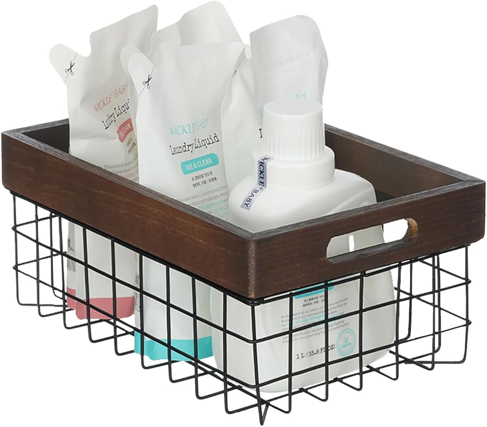 Materials & Assemble: Set of 3 pantry storage bins made of wrought iron and weathered wood, and gives the baskets a rustic feel. This basket comes pre-assembled, no tools or hardware needed; Metal baskets can be wiped with a soft cloth as needed.