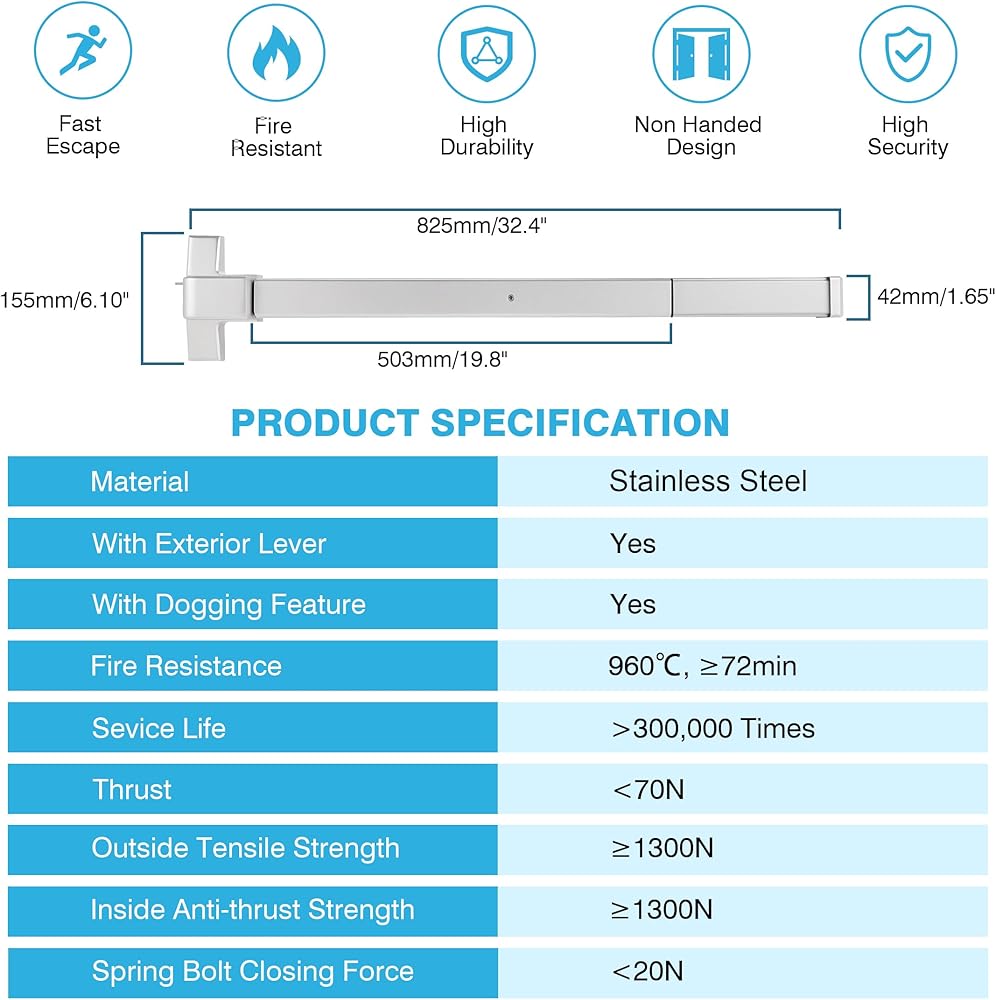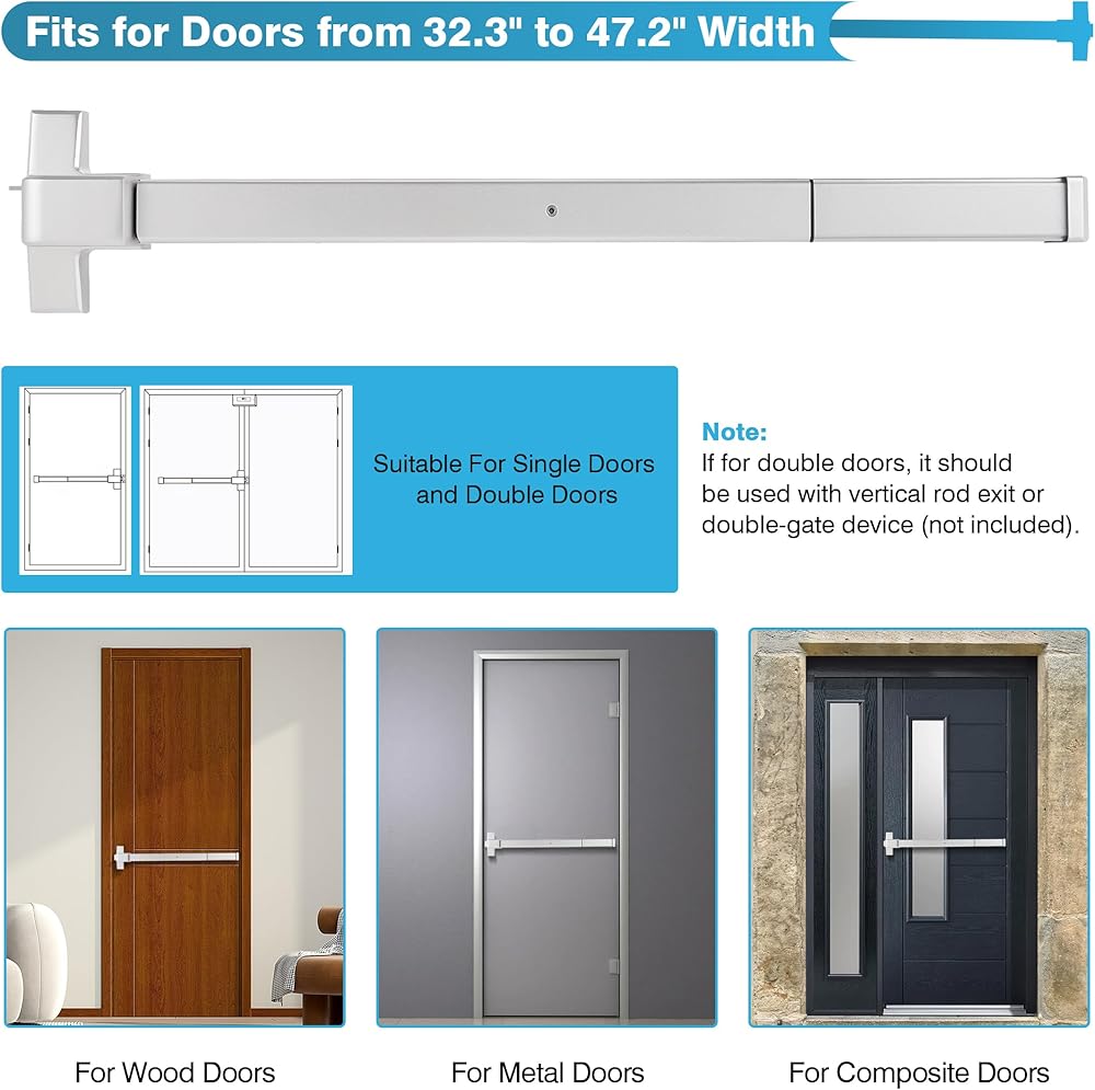 【توافق عالي】الطول الإجمالي لجهاز الذعر لباب الخروج في حالات الطوارئ من IRONWALLS هو 32 بوصة، مناسب لمعظم الأبواب الخشبية/المعدنية بعرض 32 بوصة - 47 بوصة. ويمكن أيضًا تركيبه على الأبواب المفتوحة اليمنى واليسرى، مما يضمن تعدد الاستخدامات في التطبيق. بالإضافة إلى ذلك، يمكن قص ذيل القضيب ليناسب الأبواب الضيقة. يرجى ملاحظة أن عرض الباب يجب أن يكون أطول من طول شريط الذعر.