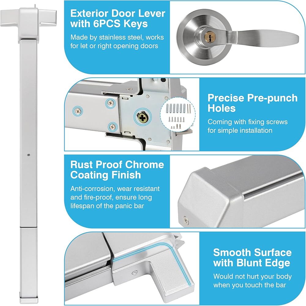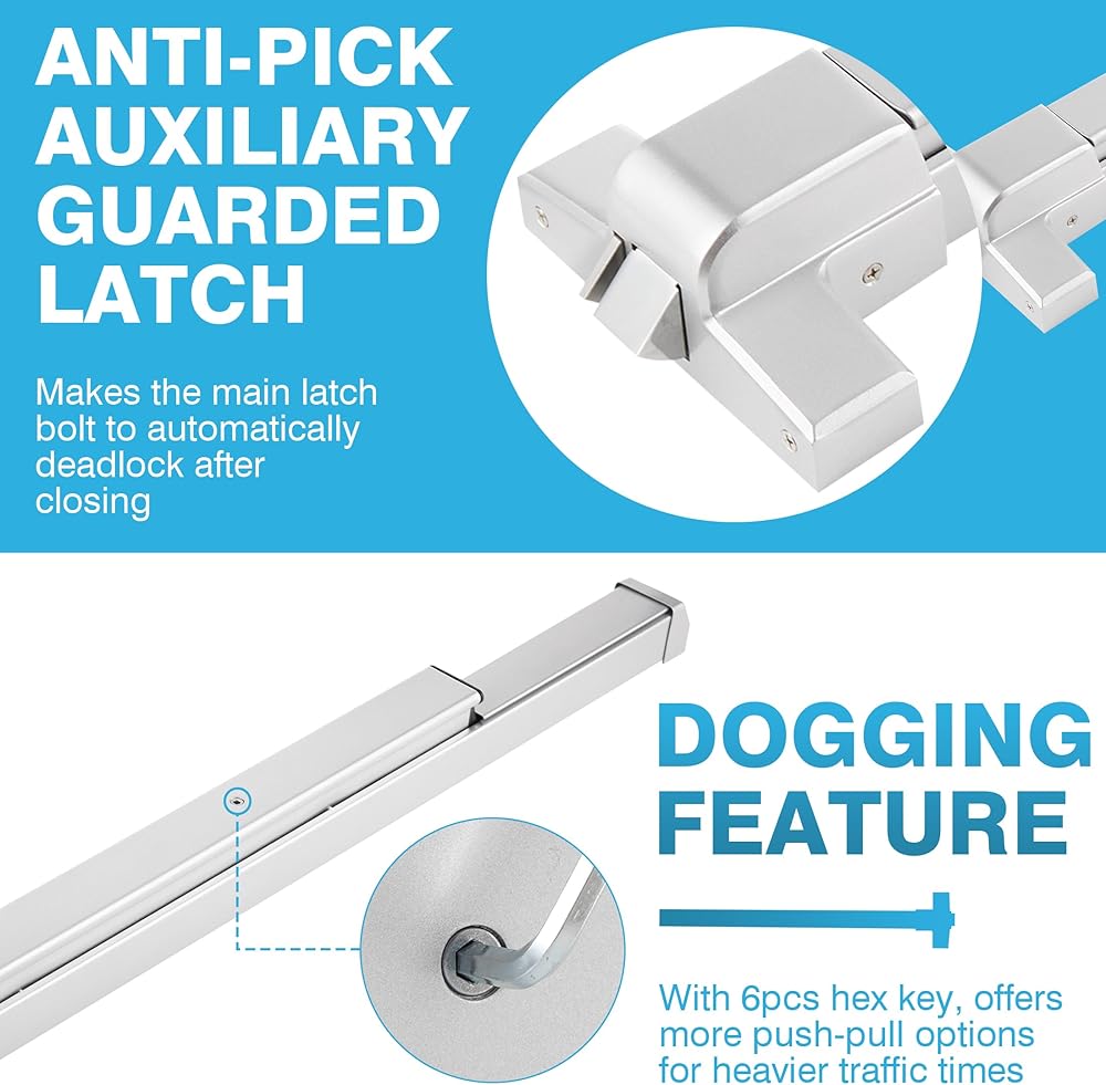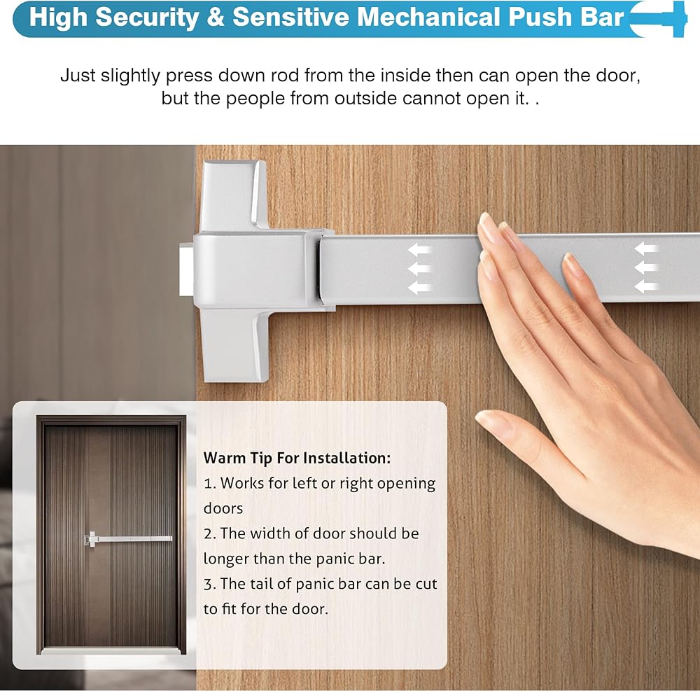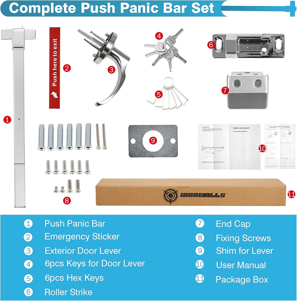 【تركيب بسيط】يأتي قفل شريط الدفع الفضي التجاري هذا مع جميع الملحقات الضرورية للتركيب السريع، بما في ذلك شريط الدفع، وغطاء الذيل، ومقبض القفل، ورافعة الباب مع المفاتيح، ومفاتيح سداسية، وملصق الطوارئ، ومسامير التثبيت.