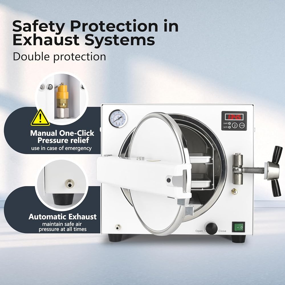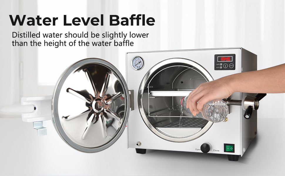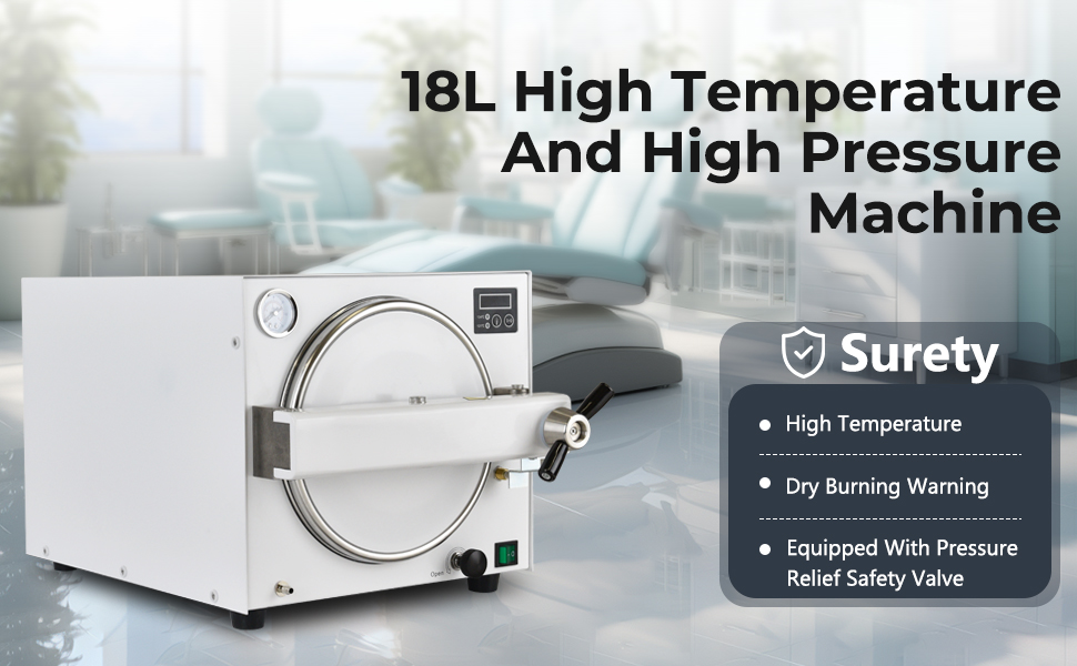 درجة الحرارة العالية والضغط العالي: يتوفر خياران لدرجة الحرارة لتختار من بينهما، 121 درجة مئوية لمدة 30 دقيقة/134 درجة مئوية لمدة 10 دقائق للتنظيف بدرجة حرارة عالية. تستخدم الآلة تكنولوجيا التحكم بالرقاقة وهي مجهزة بمقياس ضغط خارجي وشاشة LED، مما يسمح بمراقبة الوقت الحقيقي لضغط تشغيل الآلة ودرجة حرارتها.