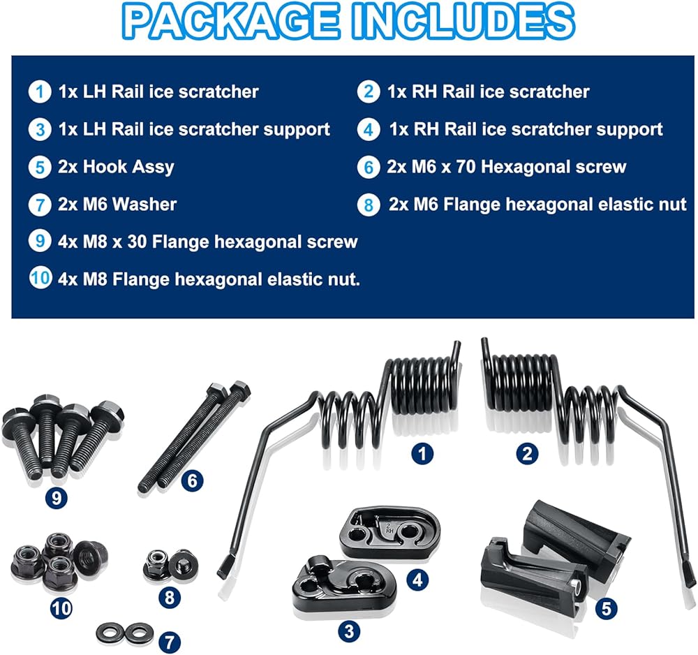 قائمة المنتجات: تتضمن مجموعة أدوات خدش الجليد 1x أداة خدش الجليد على السكك الحديدية LH، 1x أداة خدش الجليد على السكك الحديدية RH، 1x دعامة خدش الجليد على السكك الحديدية LH، 1x دعامة خدش الجليد على السكك الحديدية RH، 2x Hook Assy، 2x M6 x 70 برغي سداسي، 2x M6 غسالة، 2x M6 شفة صامولة مرنة سداسية، 2x M8 x 30 شفة برغي سداسية، 2x M8 شفة صامولة مرنة سداسية.