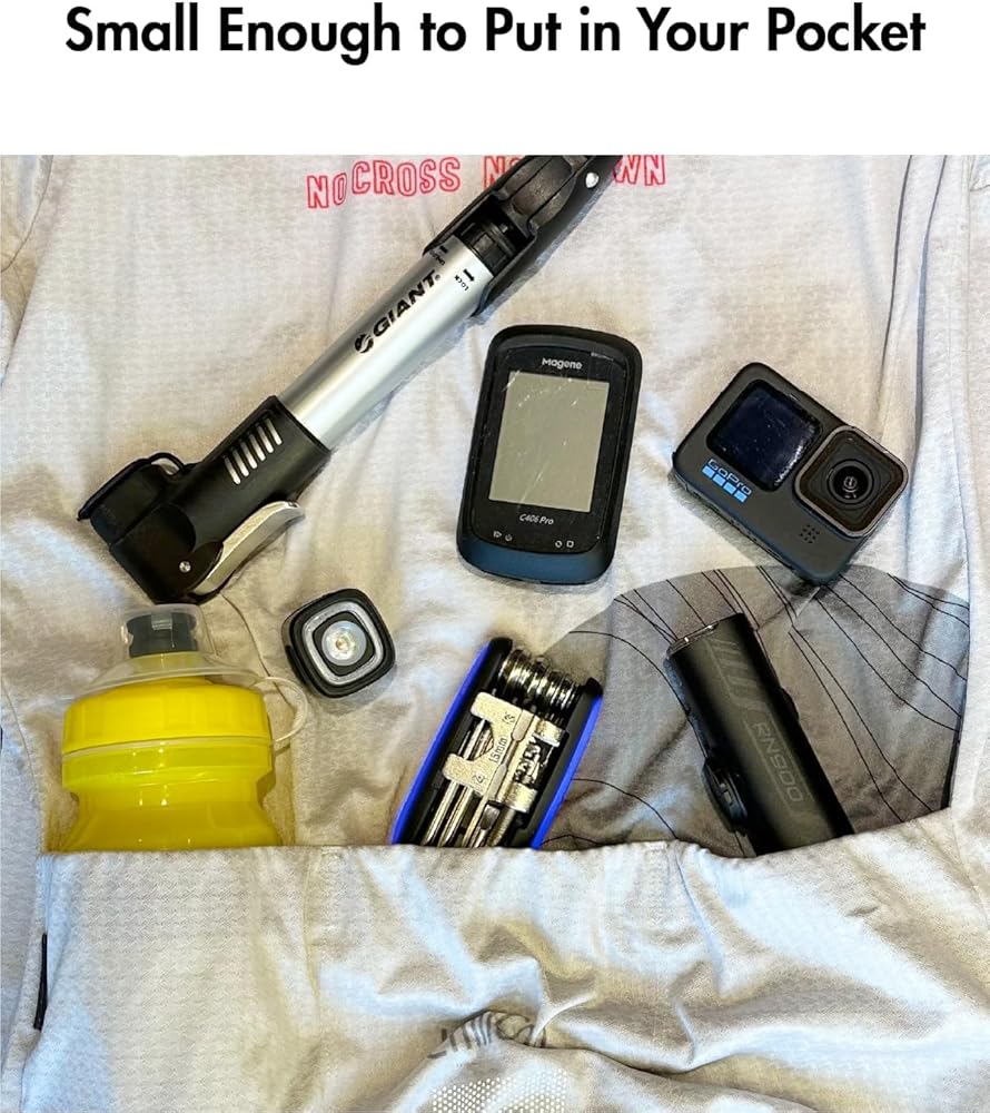 سهلة الحمل: فقط بمقاس 3.7 × 2.1 × 1.1 بوصة (الطول × العرض × الارتفاع) عند طيها، صغيرة بما يكفي لوضعها في حقائب السرج أو الجيوب، ويمكن حملها في أي مكان، ولا تضيف حملاً إلى راكبي الدراجات. يزن 0.4 رطل فقط.