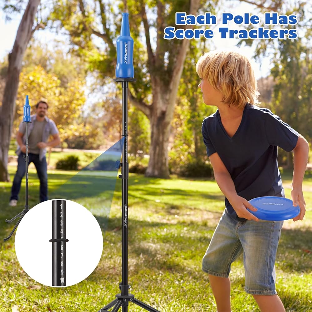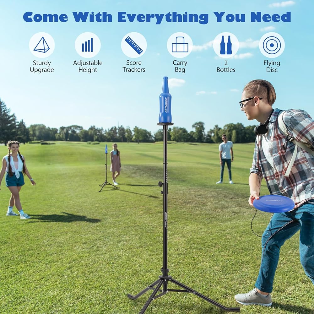 الكل في واحد: يتم الجمع بين لعبة الفريسبي ولعبة إسقاط الزجاجة. يمكنك لعب الفريسبي بمفردك أو استخدام الفريسبي لرمي الزجاجات. تحتوي العبوة على عمودين، وصينيتين، وزجاجتين، وطبق طائر واحد، وحلقة تحديد النقاط، وحقيبة حمل من النايلون، كل ما تريده متضمن.