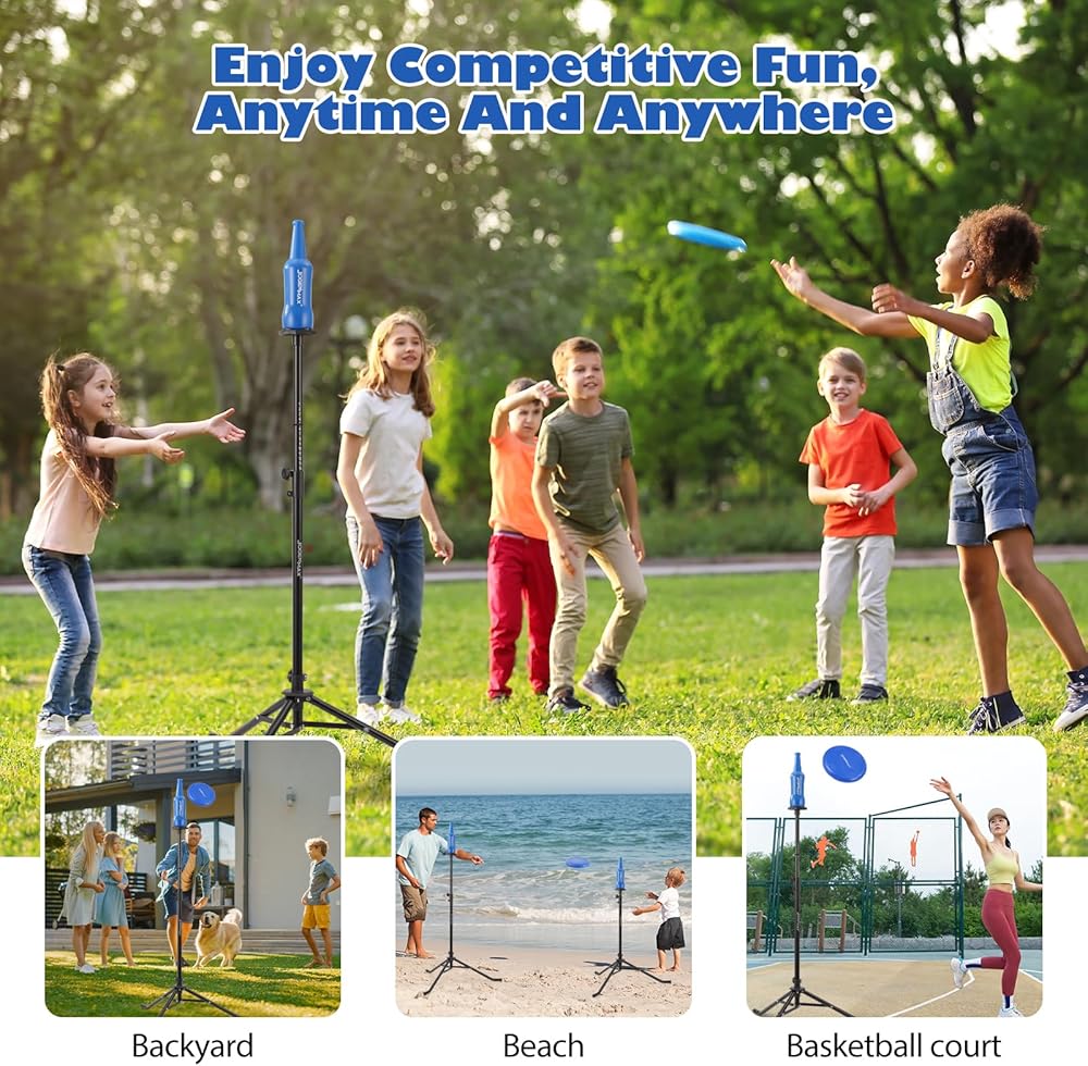 رؤية مطورة: مجموعة ألعاب الأقراص الطائرة الخاصة بنا ليست مصنوعة من البلاستيك، ولكنها مصنوعة من مادة معدنية سميكة. إنه ليس تصميمًا تقليديًا يتم تثبيته على الأرض، ولكنه تصميم ثلاثي القوائم قوي. لا يتطلب أي أدوات إضافية للتثبيت وهو ليس مصممًا للمروج والشواطئ فقط.