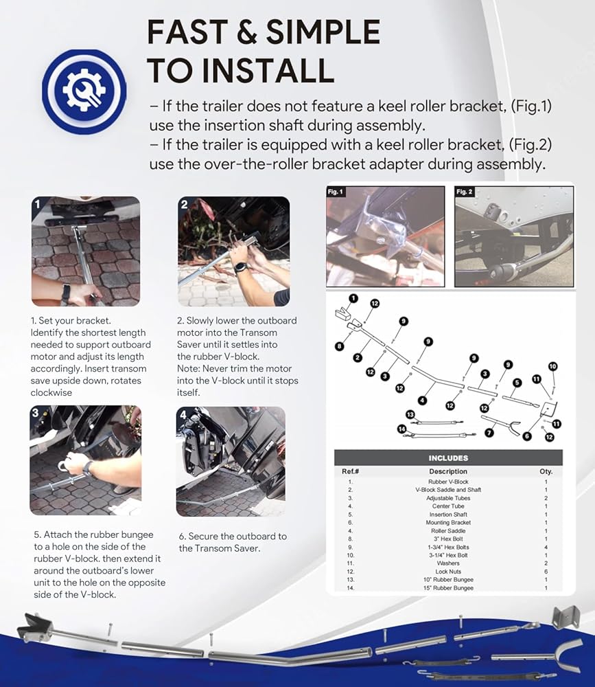 【Effortless Installation】 Installing our Transom Saver is straightforward and quick. Simply position the bracket, insert the transom saver upside down, rotate clockwise to attach the V-block to the lower unit, and adjust the trim for a proper fit. Secure with the included rubber bungee, and you're all set for a safe and secure journey. This easy installation process saves time and effort, allowing you to focus on enjoying your boating experience.