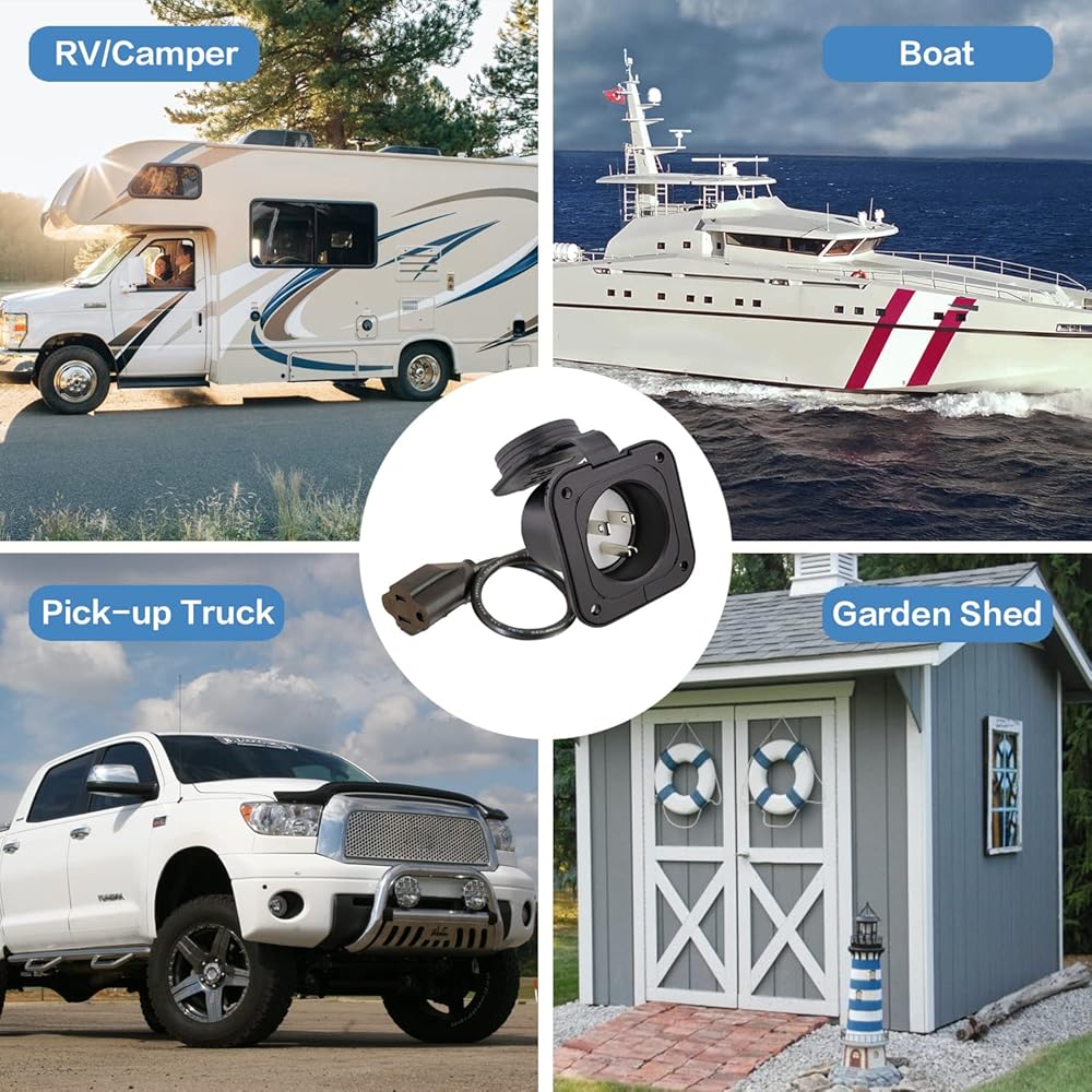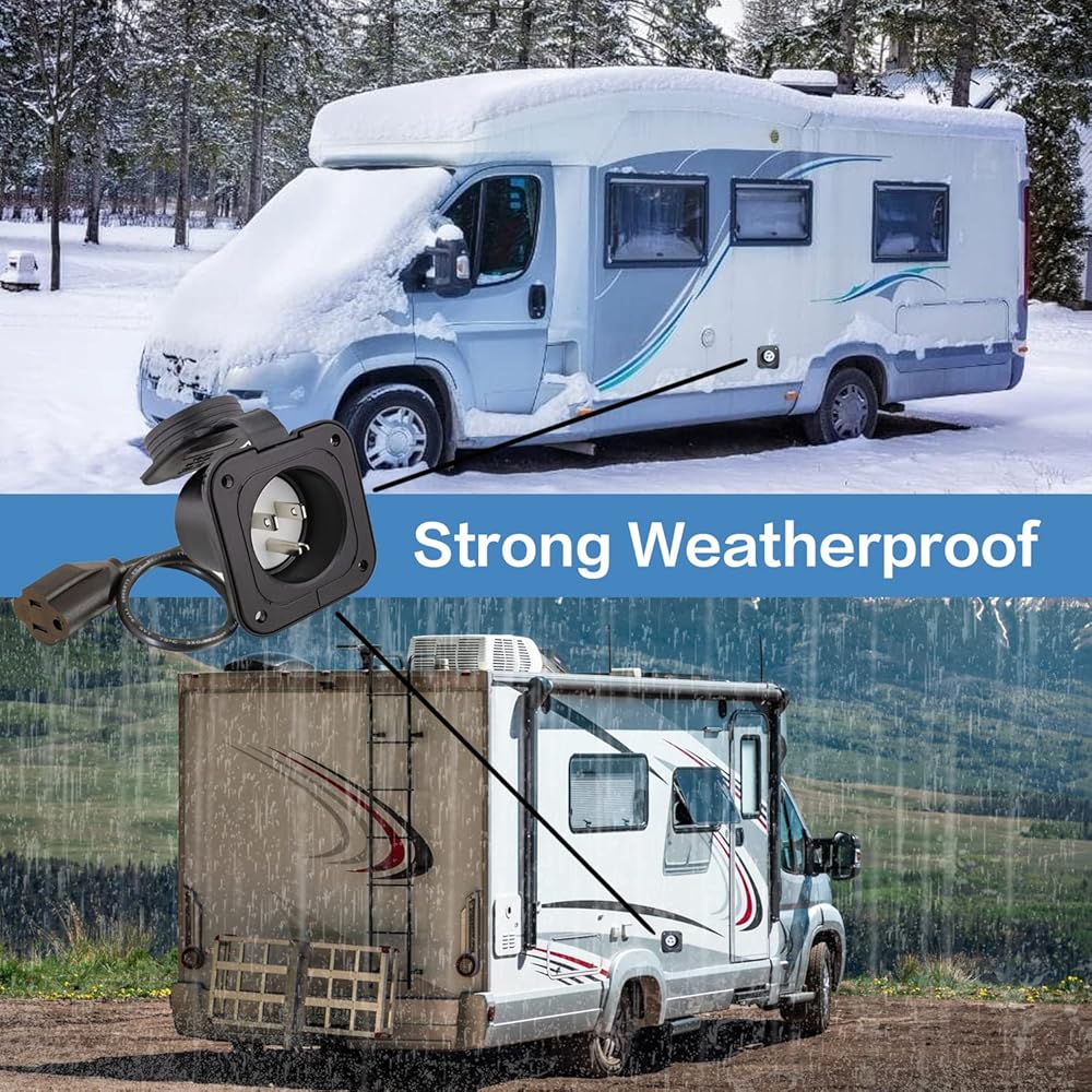 • This RV power outlet has an outlet cover (including threads, more tightening) and a back cover to protect it from heavy rain, snow and dust.