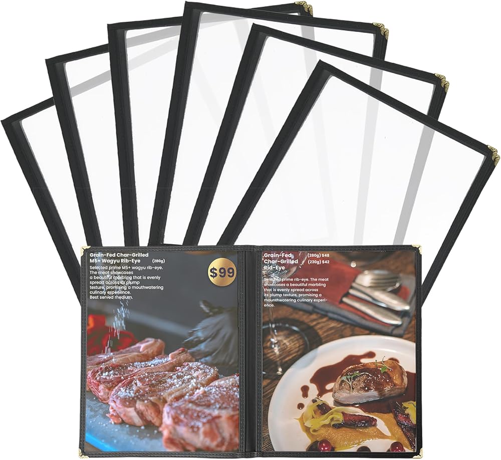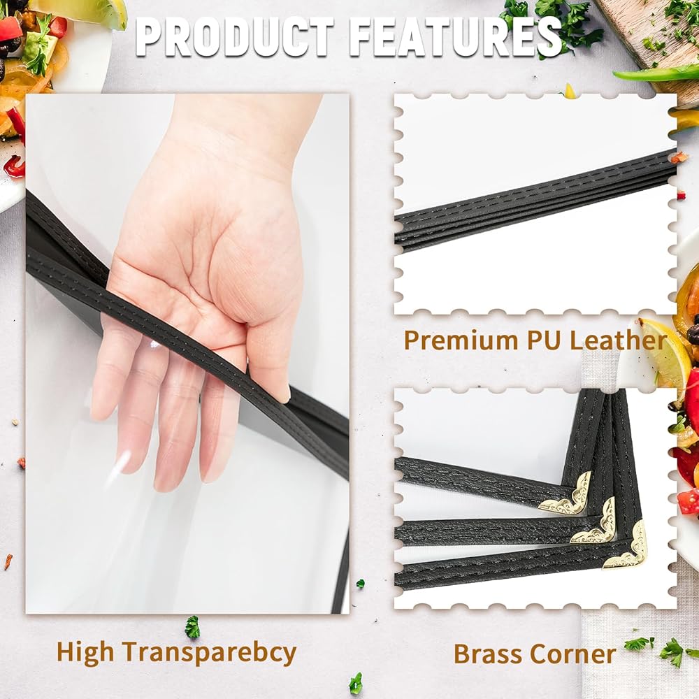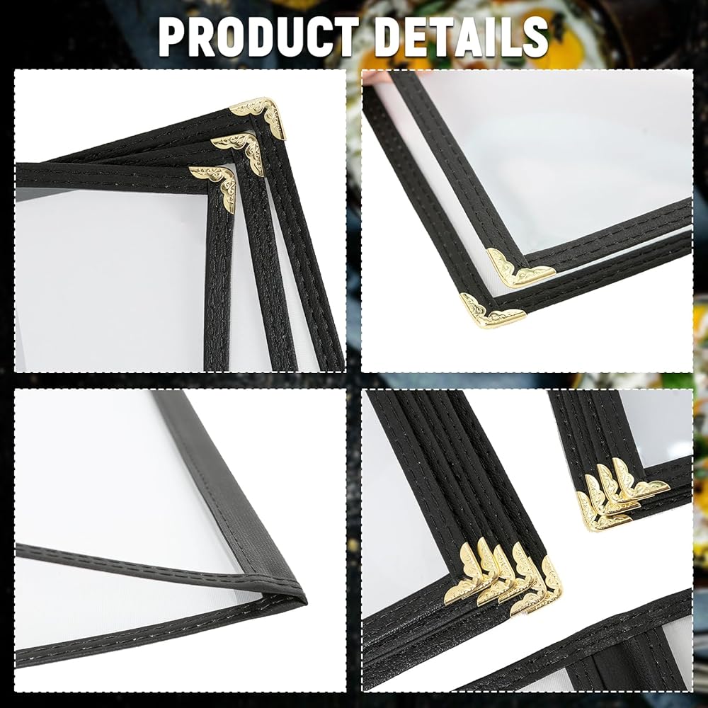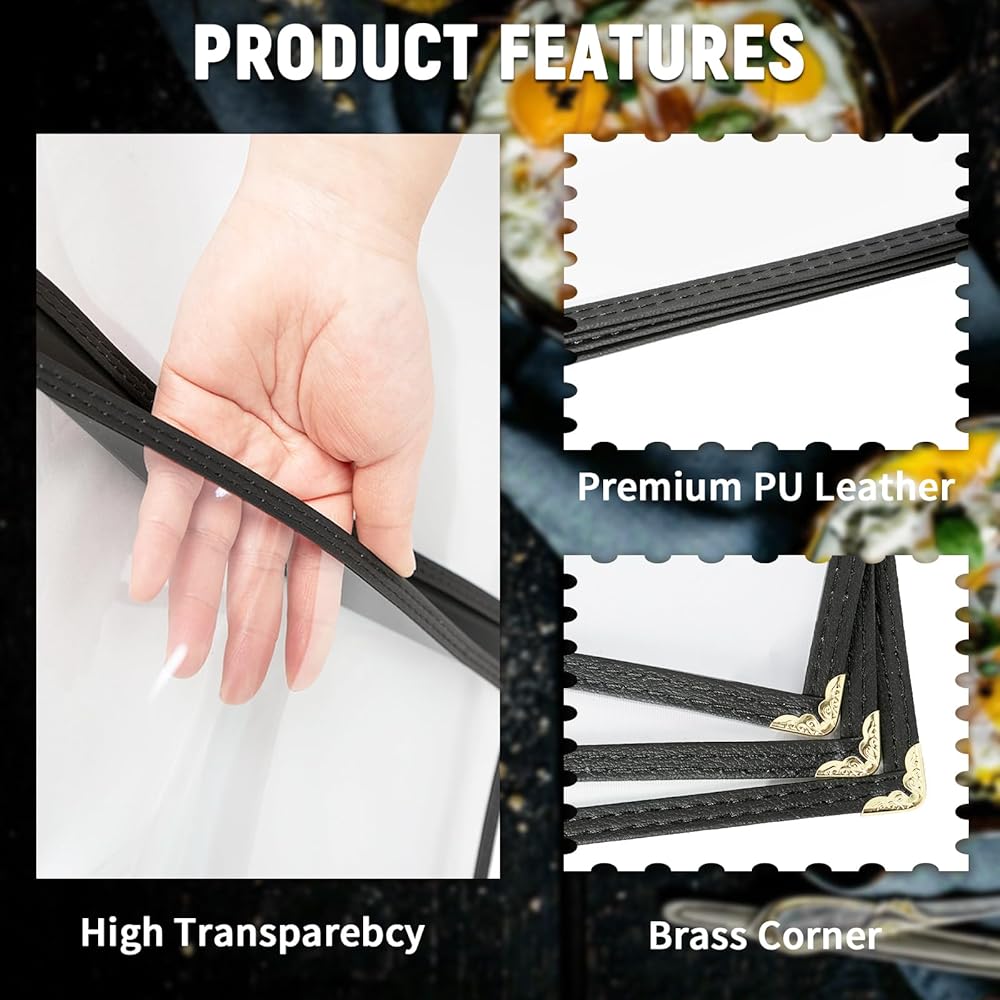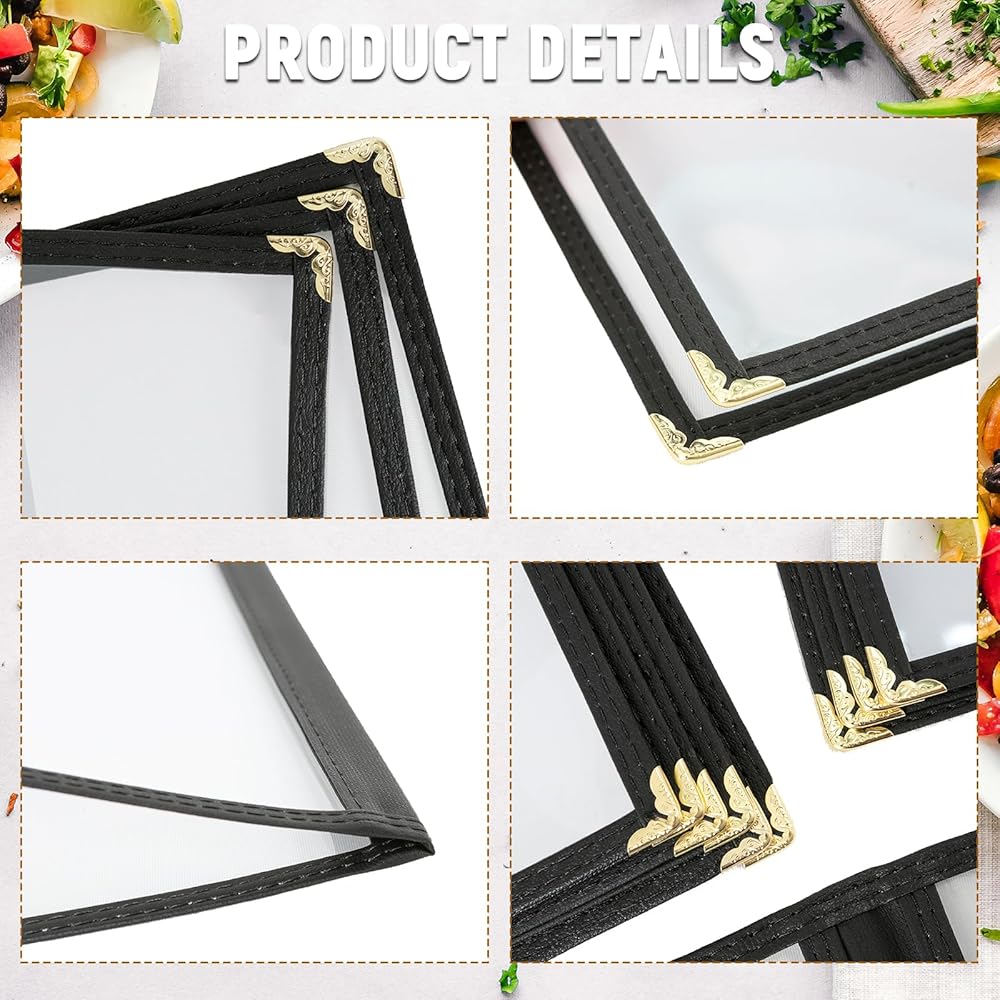 خامة فاخرة: تتميز أغطية قائمة المطاعم هذه بزخرفة سوداء أنيقة مع واقيات زوايا ذهبية، مما يضيف لمسة من الرقي إلى أي مكان لتناول الطعام مع حماية قوائمك.