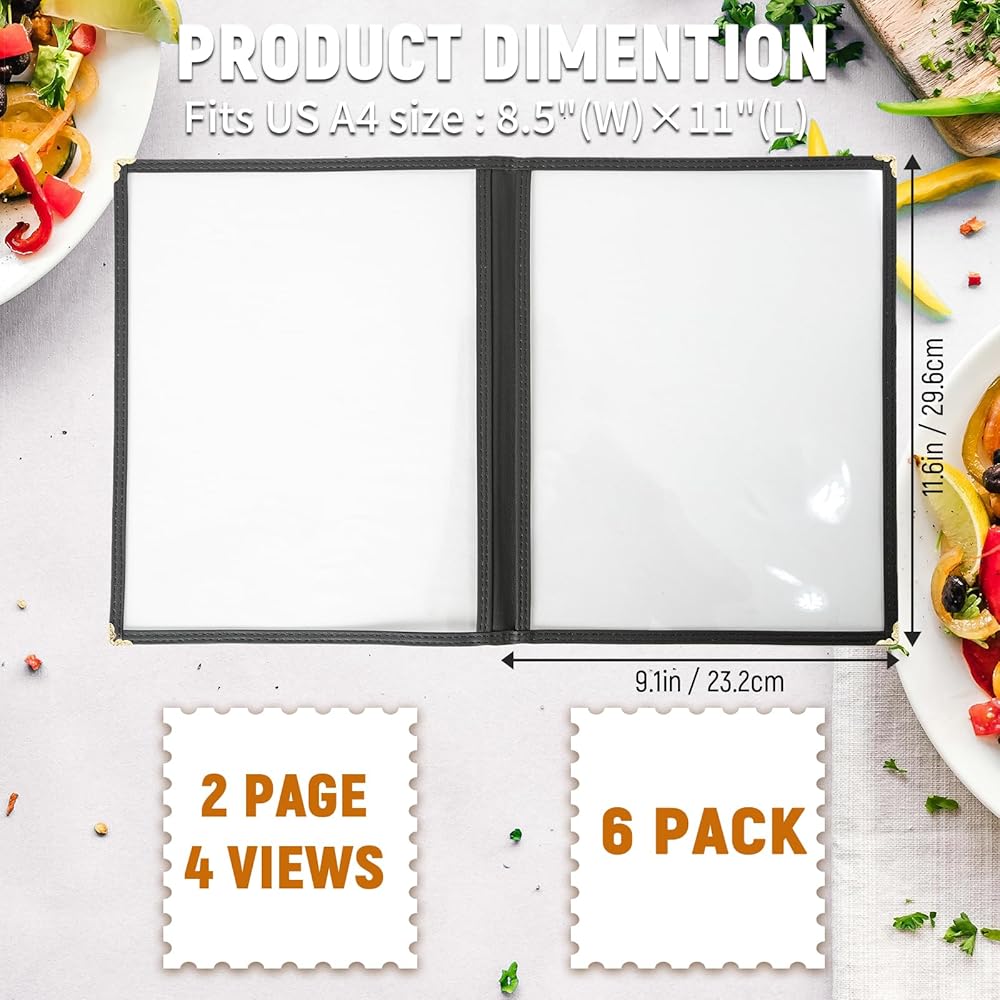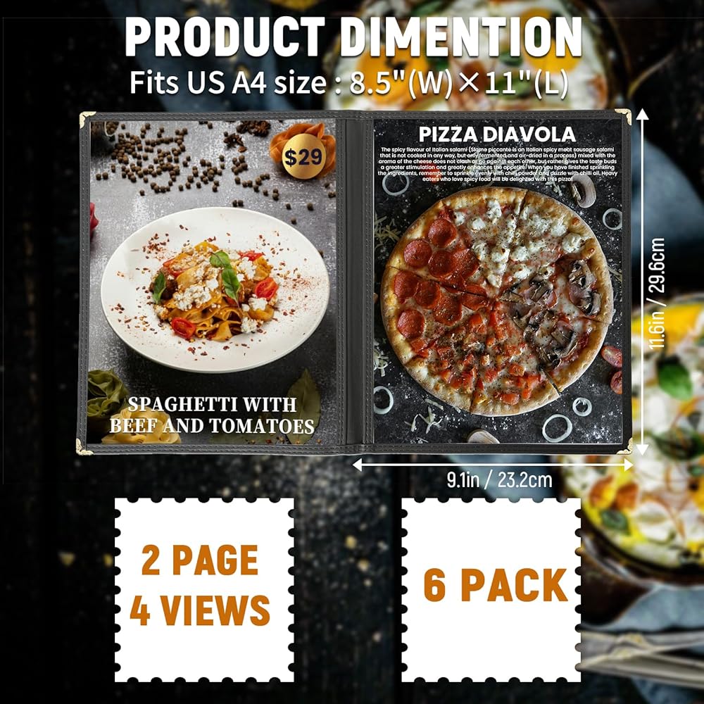 تتضمن العبوة: تتضمن العبوة 6 قطع 1 صفحة 2 عرض 8.5 × 11 بوصة من حاملات القائمة، يمكن أن توفر أغطية القائمة هذه عرضًا رائعًا لأطباقك وتخصصاتك.